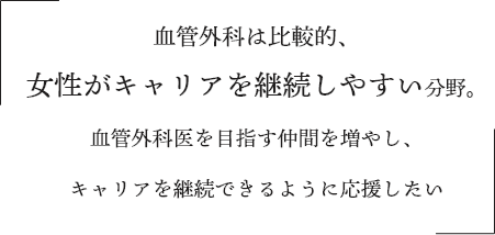 私は心臓血管外科専門医ですが、主に血管外科を担当しています。血管外科は診断から治療までをトータルで行うことも多く、またダイナミックな外科手術だけでなく繊細な血管内治療も行うことができ治療に対する幅広いアプローチが可能です。外科領域の中でも比較的、女性がキャリアを継続しやすい分野ではないかと思います。