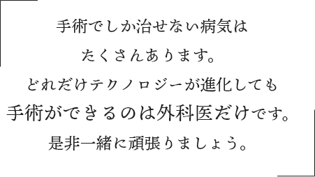 毎日いろいろなことが起こって、忙しいし勤務時間が長いとは思いますが、そんな患者さんを毎日心配して自分の手で治療して、元気になって退院していった時、本当に嬉しいです。手術でしか治せない病気はたくさんあります。どれだけテクノロジーが進化しても手術ができるのは外科医だけです。是非一緒に頑張りましょう。