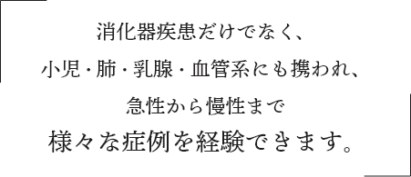 当教室ではとてもアットホームな雰囲気で日々楽しく仕事をしています。消化器に特化した疾患だけではなく、小児・肺・乳腺・血管系にも携われ、また急性から慢性まで様々な症例を経験できます。
