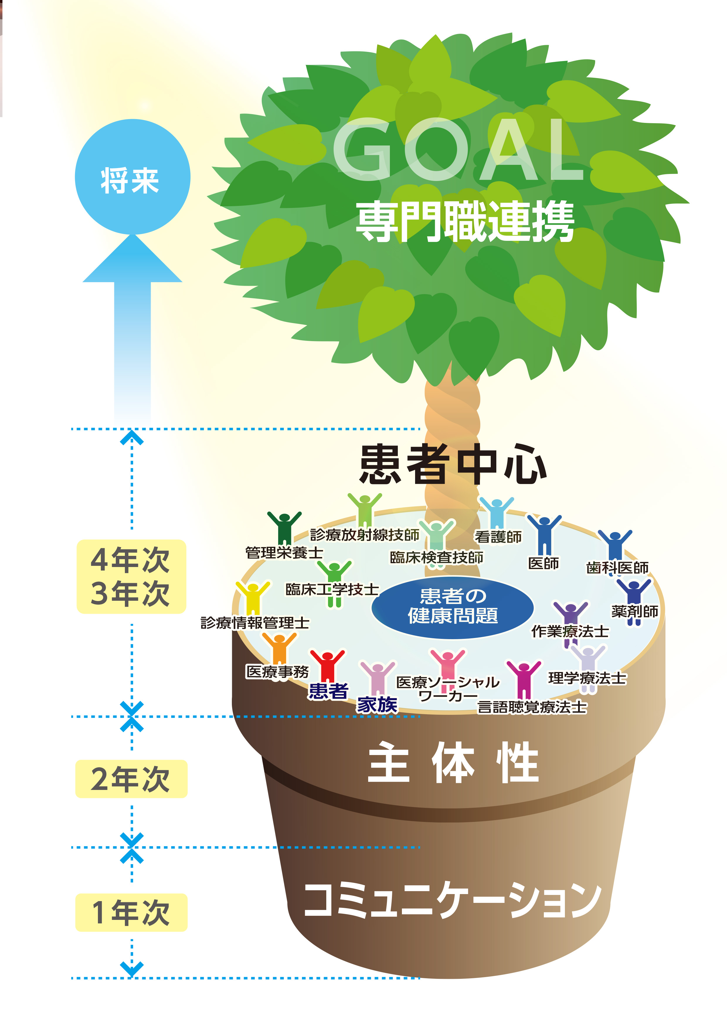 | まず始めは、1回目ワークショップの「グループワーク1:アセンブリ教育の目標をわかり易く可視化する」で考えられた「アセンブリ教育の目標をひと目で示す図」の最終案が大槻センター長から紹介されました。この図によって、教員の目指す方向が一定の方向を向き始めると思われます。 引き続き、今回ご講演をお願いした三重大学医学部の後藤道子先生より「他者とのコミュニケーション ~異文化理解~」というタイトルで、アセンブリ教育の基盤となるコミュニケーションの重要性について「他者とのコミュニケーション」を「異文化理解」という切り口でご講演を頂きました。 |