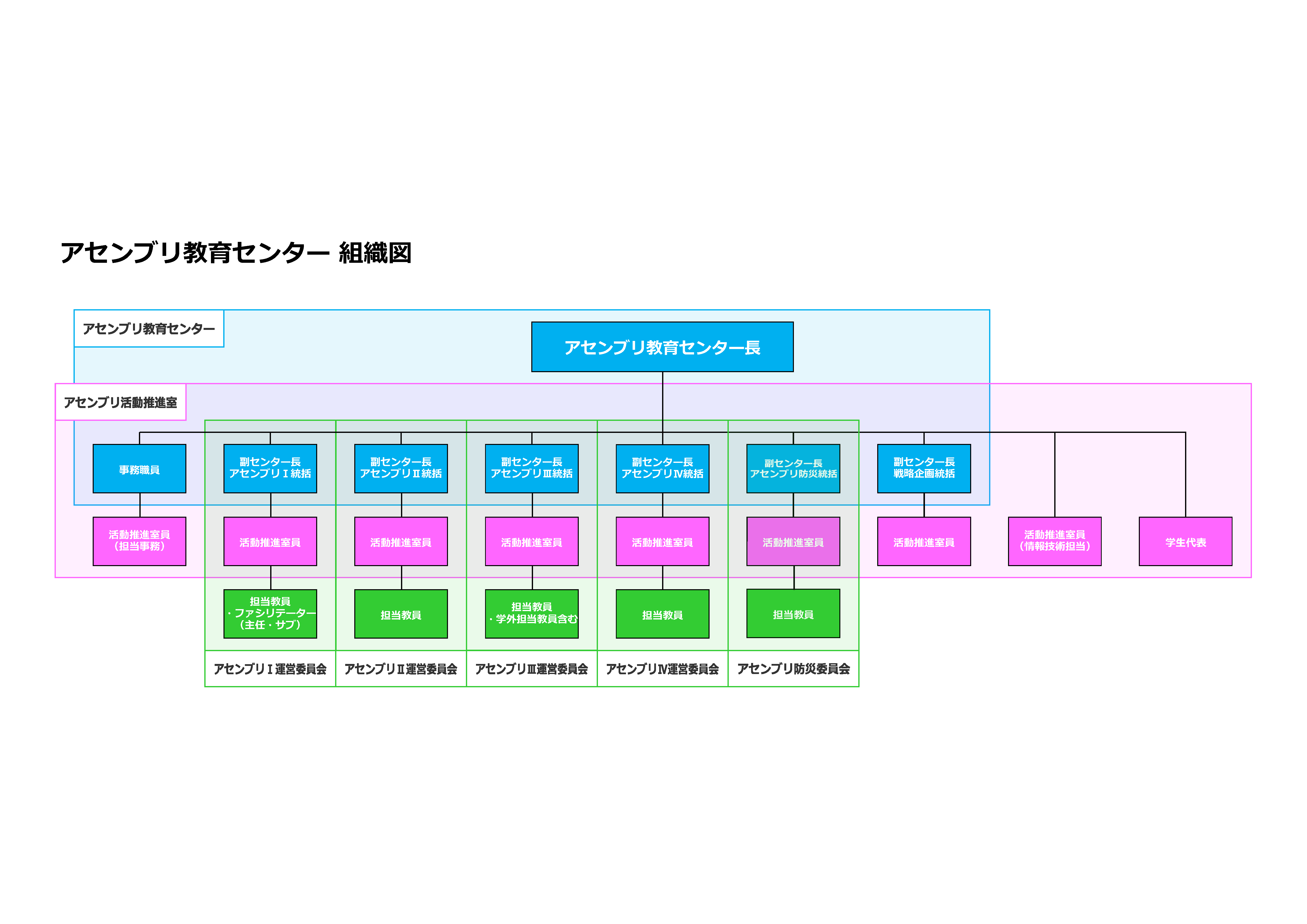 「アセンブリ教育センター」は2017年4月に設立され、センター長、副センター長、専任の事務職員で構成されています。また、副センター長と各学部、研究推進本部の教員、事務職員、学生代表からなる「アセンブリ活動推進室」を設け、各アセンブリの活動内容の改善・決定を行っています。さらに、アセンブリⅠ~アセンブリⅣではそれぞれ「運営委員会」を設けており、運営委員がアセンブリの授業運営を担っています。