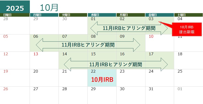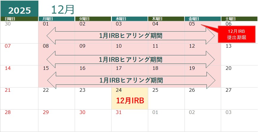 | ②IRB審査月の決定 依頼内容の確認後、IRB審査月を通知します。IRB審査月に合わせたヒアリング期間内でヒアリングの日程を調整します。 |