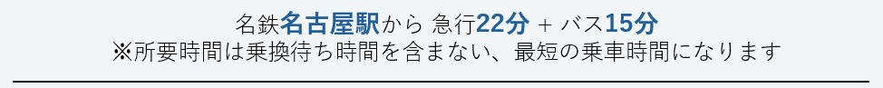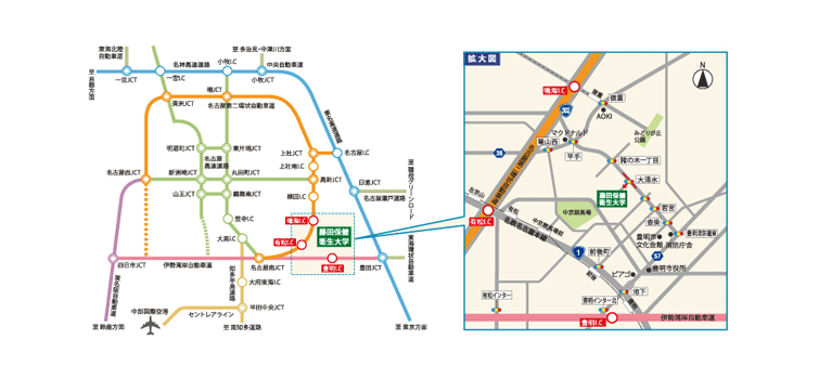 | 有料道路利用 | 名古屋第二環状自動車道「鳴海I.C」から約10分、または「有松I.C」から約15分。 伊勢湾岸自動車道「豊明I.C」から約15分(東京方面からの出口) |