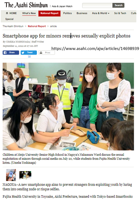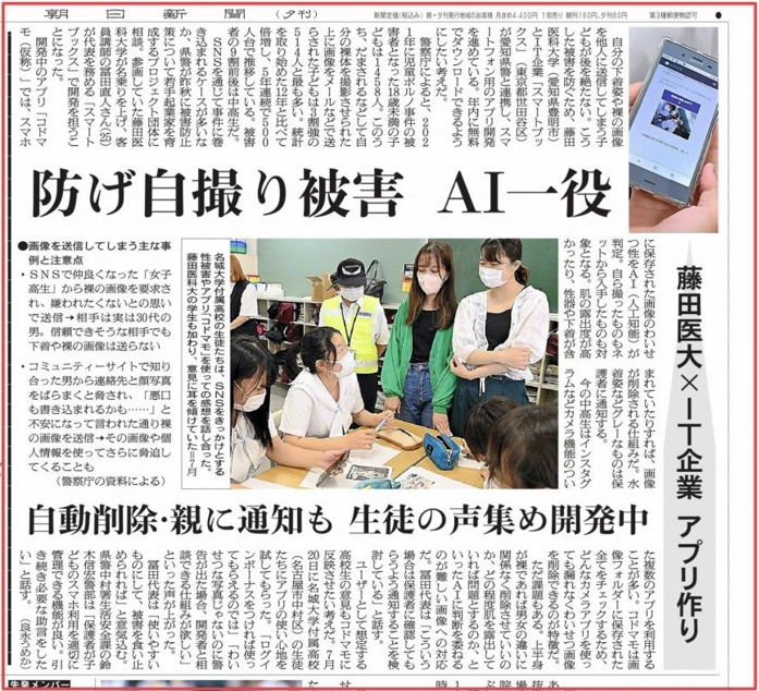 2022年11月26日に「コドマモ」試作版の実証実験が行われ、学生約 15名が参加しました。本アプリは、人工知能(AI)がわいせつと判断すると、撮った段階で画像をスマホから削除するよう促すメッセージが出て、保護者にも通知が行く仕組みとなっており、実証実験では試作版アプリを使用し、使用感や改善点など意見を出し合いました。