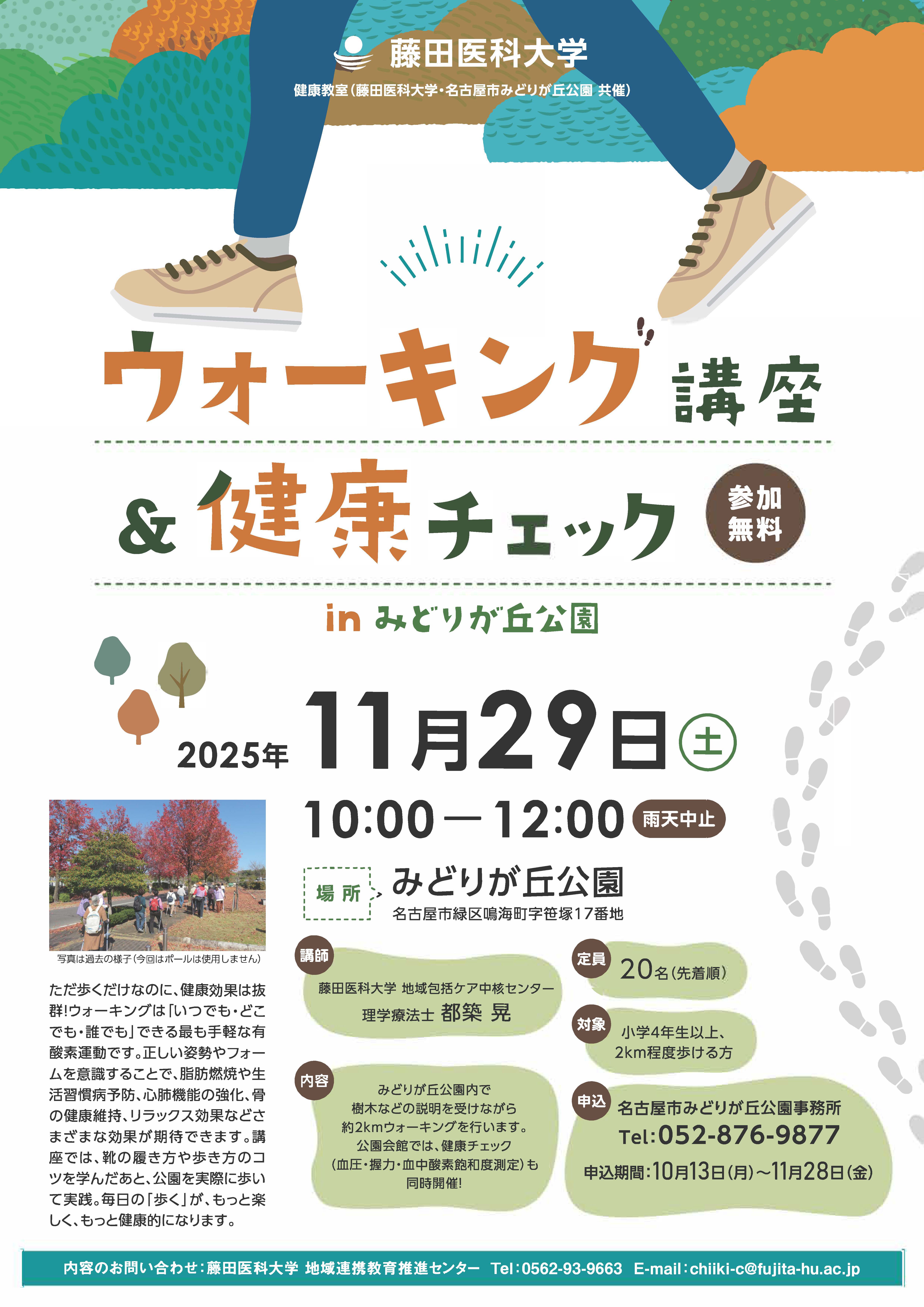 みどりが丘公園健康教室 Tweet 終了しました。 お気軽にご参加ください! ◆開催日時:2025年11月29日(土)10:00~12:00 ※雨天決行 ◆開催場所:みどりが丘公園(名古屋市緑区鳴海町字笹塚17番地) ◆内 容:ウォーキング講座&健康チェック(随時開催) ◆講 師:藤田医科大学地域包括ケア中核センター 講師 都築 晃 ◆対 象:小学4年生以上、2km程度歩ける方 ◆定 員:20名(先着順) ◆申 込:名古屋市みどりが丘公園事務所 Tel:052-876-9877