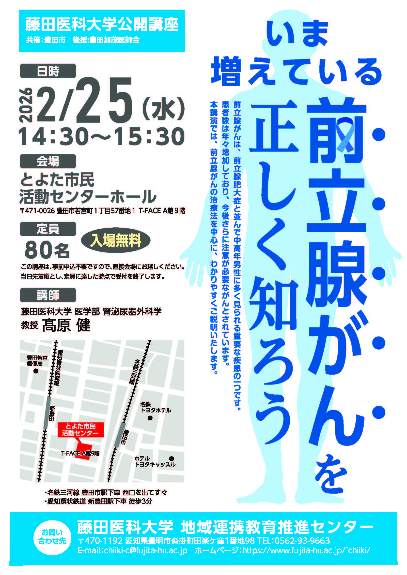 | 前立腺がんは、前立腺肥大症と並んで中高年男性に多く見られる重要な疾患の一つです。患者数は年々増加しており、今後さらに注意が必要ながんとされています。本講演では、前立腺がんの治療法を中心に、わかりやすくご説明いたします。 ◇開催日時:2026年2月25日(水)14:30~15:30 ◇会場:とよた市民活動センター ホール(https://www.toyota-shiminkatsudo.net/about/facilities.html) 豊田市若宮町1丁目57番地1 T-FACE A館9階 ◇講師:髙原 健 藤田医科大学医学部腎泌尿器外科学 教授 ◇定員:80名 参加費無料 ◇事前申込不要、どなたでもご参加いただけます。 ※開場は、14時です。先着順にて受付します。 |