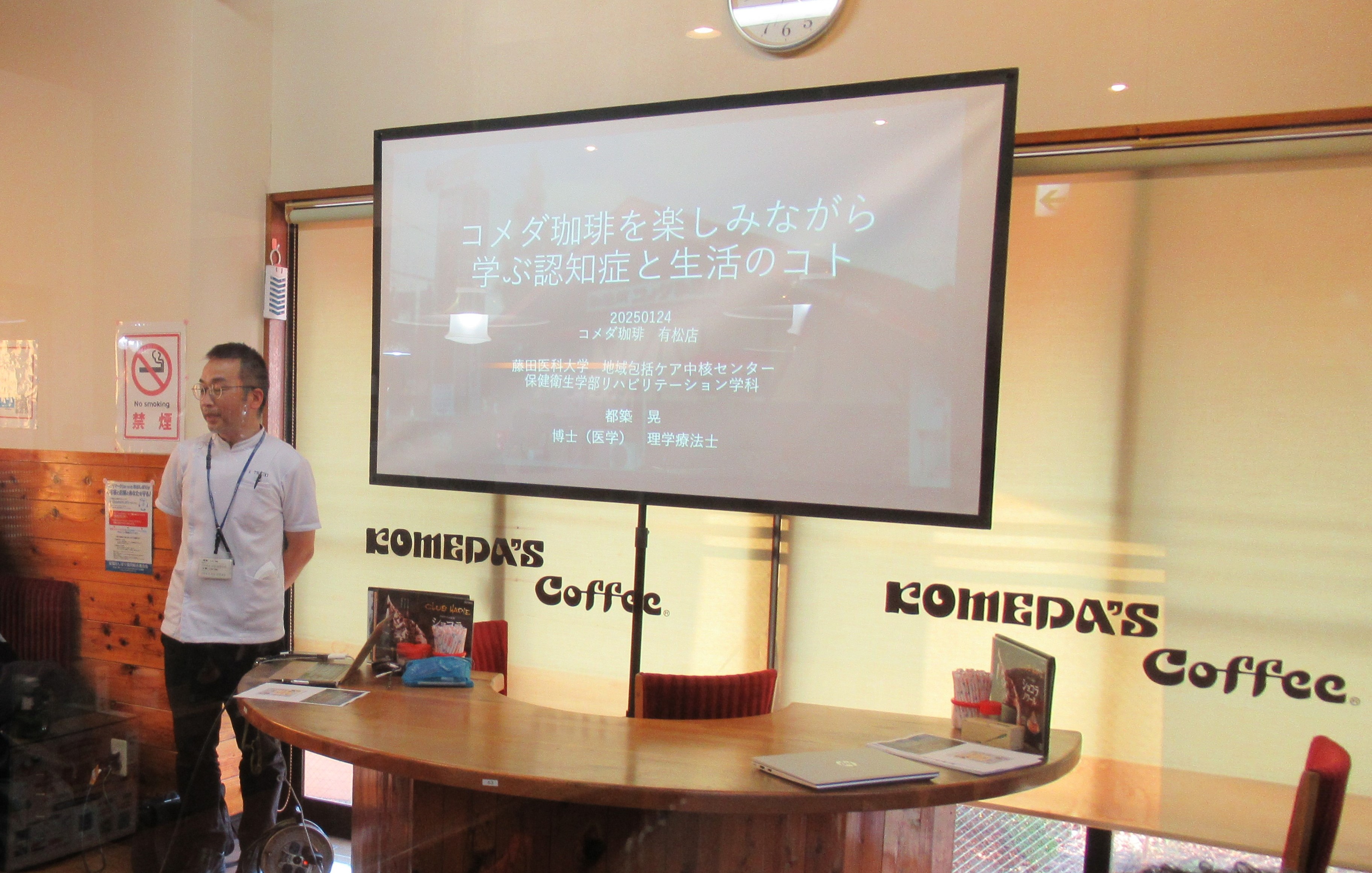 新規事業の一環として、コメダ珈琲店とのコラボレーション企画『出張健康セミナー in コメダ珈琲店 有松店』を1月24日に開催しました。講師は地域中核包括ケアセンター 都築 晃センター長補佐が務め、参加者の皆さんはコメダ珈琲店の美味しいコーヒーなどを楽しみながら、認知症と生活の関わりや楽しく安全に飲食を続けるための嚥下体操を学びました。「リラックスした雰囲気のなかで講演を楽しめた」といったご感想もいただきました。