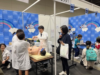 中京テレビ主催のすこやかフェスタが10月11・12日にポートメッセなごや(名古屋市港区)で開催され、本学は「キッズ白衣撮影会」と「ドキドキからだチェック」の2ブースを出展しました。2日間で約1,100人以上のお子さんが来場し、会場は多くの来場者でにぎわいました。シミュレーターを使って心臓の音を聞く体験では、教職員や学生ボランティアと交流しながら、楽しそうに取り組む様子が見られました。視力チェックには幼児から小学校高学年までのお子さんが参加し、保護者の方々も教員の説明に熱心に耳を傾けるなど、高い関心が寄せられました。