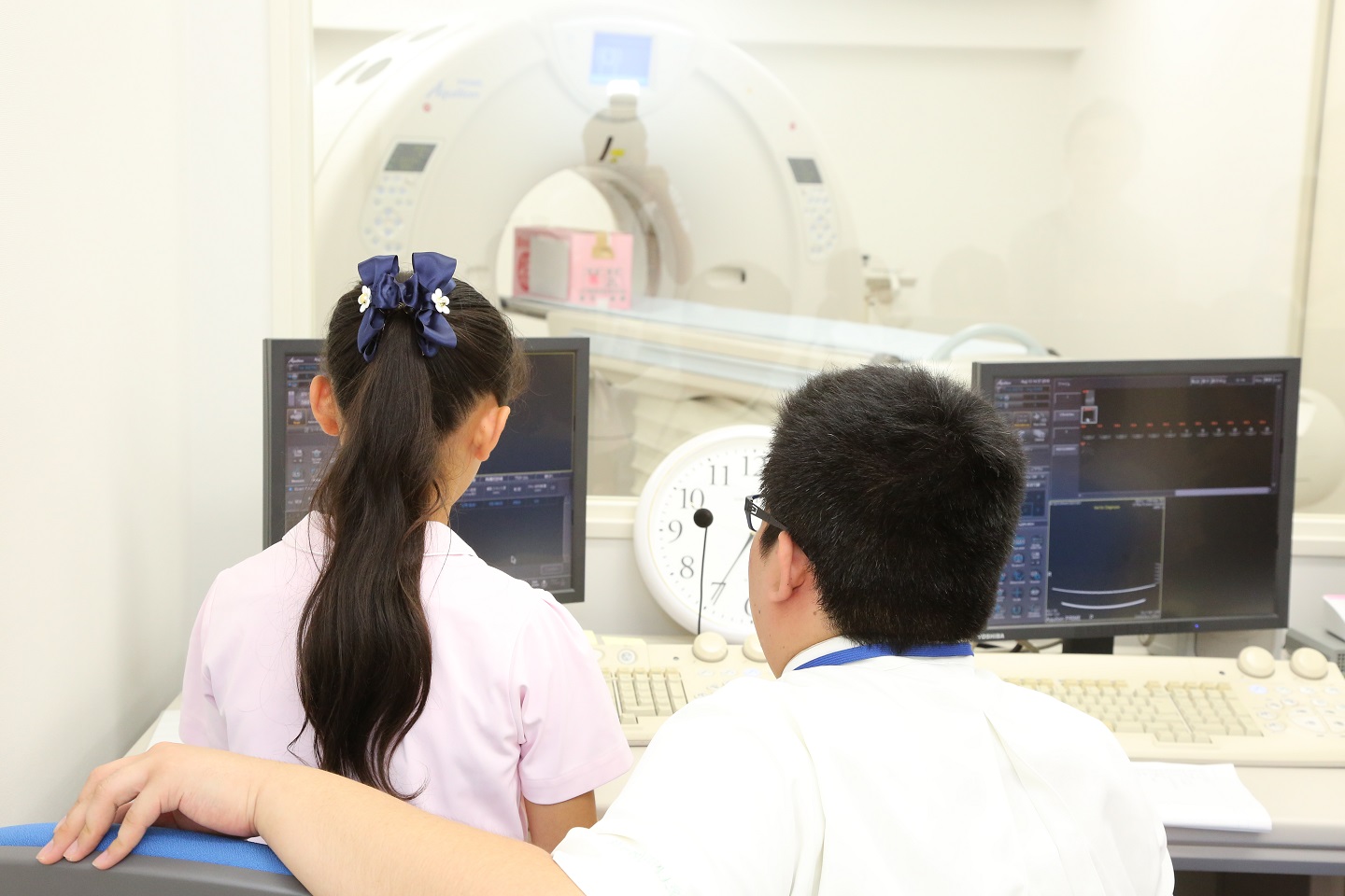 病院見学ツアーでは、「調剤体験」「放射線機器の操作体験」「手洗い方法を学ぶ」「心臓を聞く」などの多彩な内容を企画しました。子どもたちが病院で働く人の仕事内容を体験することで、自分たちの将来の職業について考えるきっかけとなり、また藤田保健衛生大学病院に親しんでいただく機会を提供することができました。