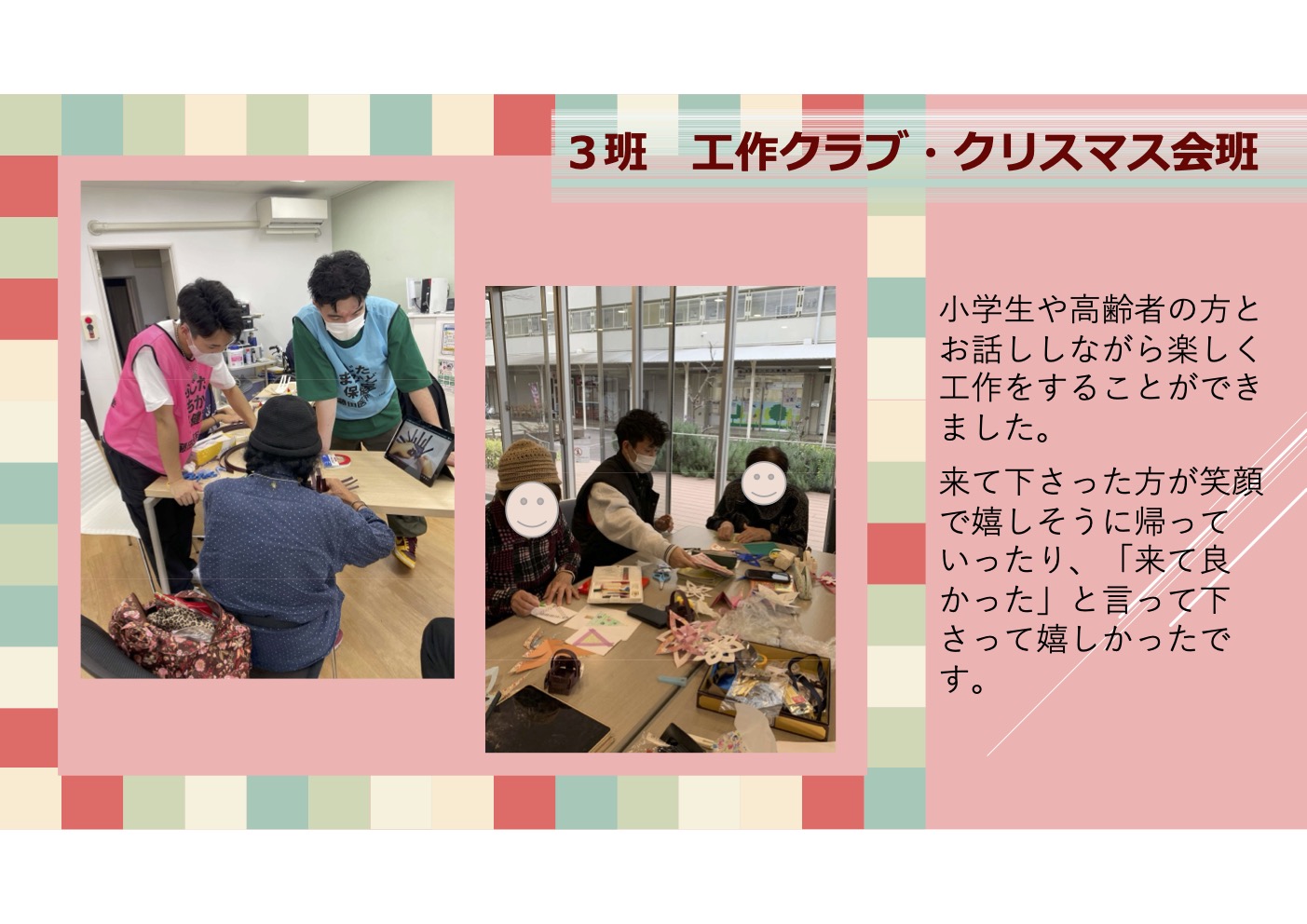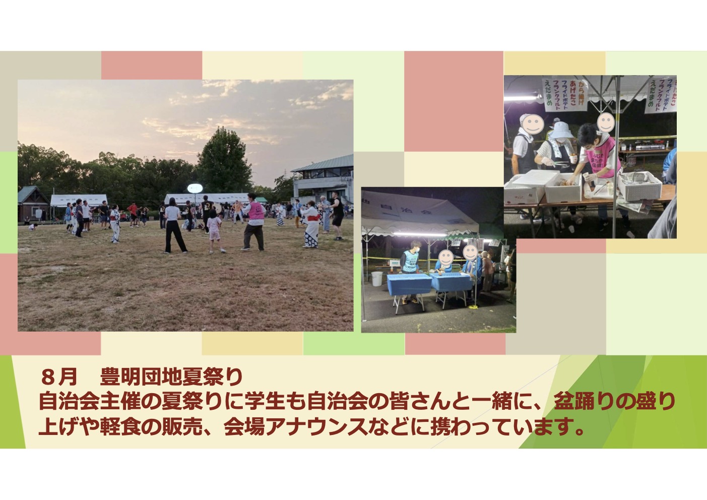 今年は夏祭りも再開され、学生も運営として参加しました。住民の皆さんと一緒に盆踊りを楽しんだり、会場アナウンスを担当したり、出店での調理・販売をしたりと活躍し、大変喜ばれ住民の皆さんとの距離も近くなっていました。