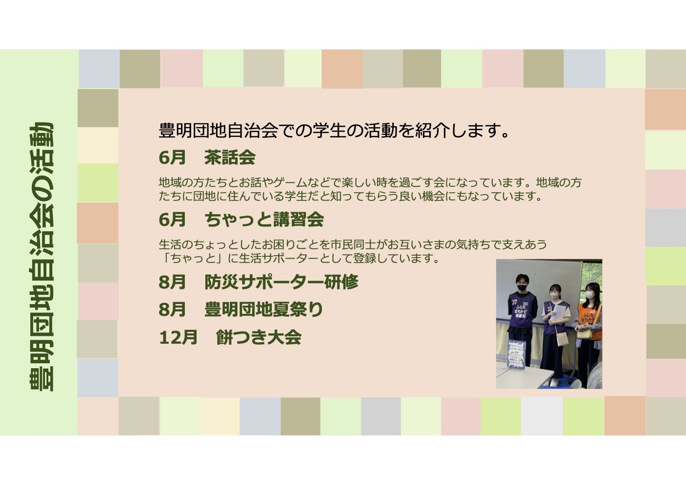 会場でも大学生が地域の団地に居住し、地域住民として活動に参加していることに感心、興味を持っていただけました。