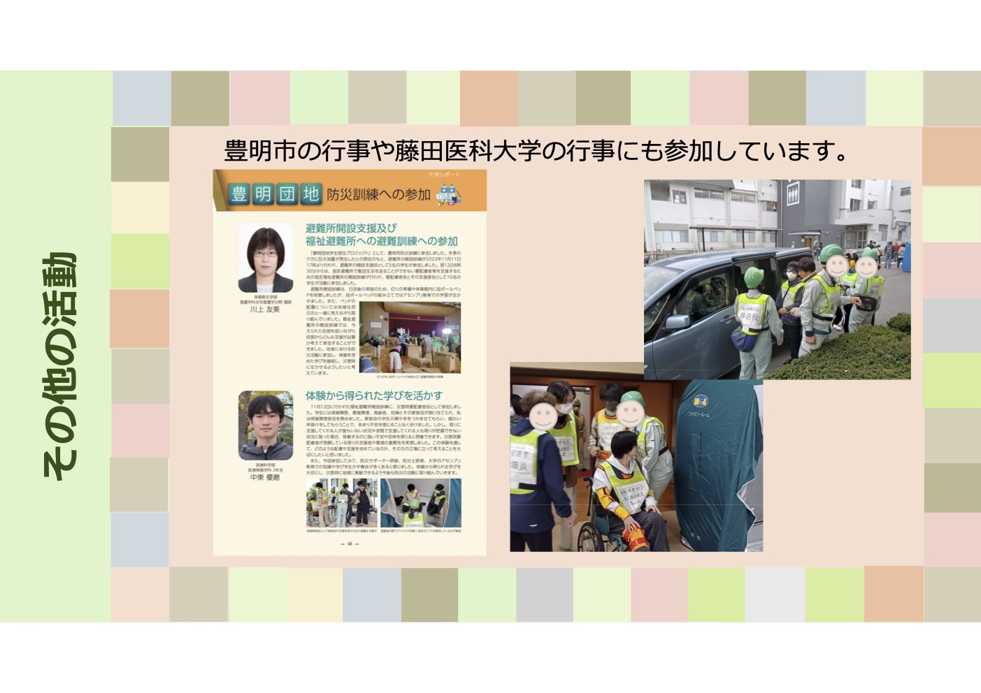 豊明市が行う防災訓練に参加しました。1日目は夕方から暗くなる中、避難所の立ち上げの訓練を実施、2日目には避難所から配慮が必要な方々を福祉避難所に移動する訓練が実施されました。