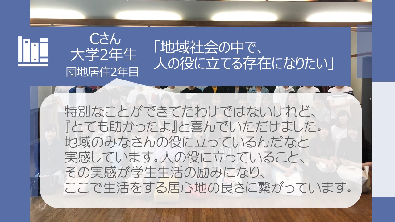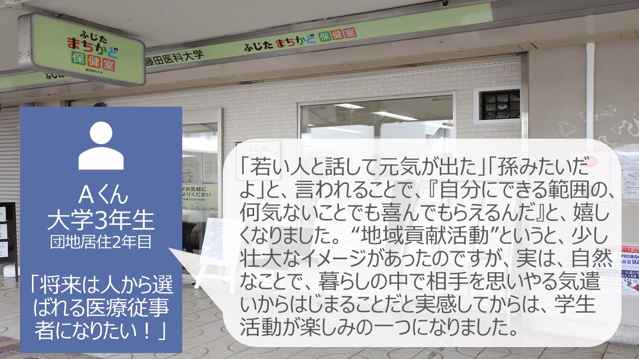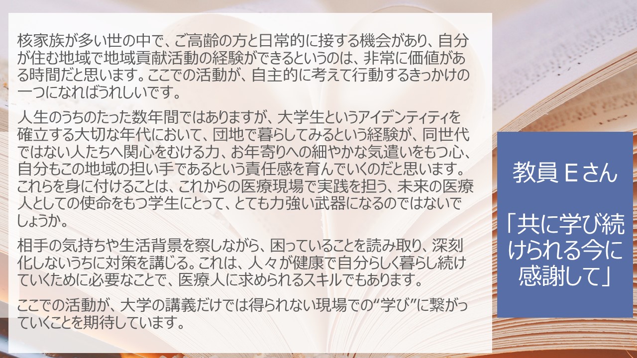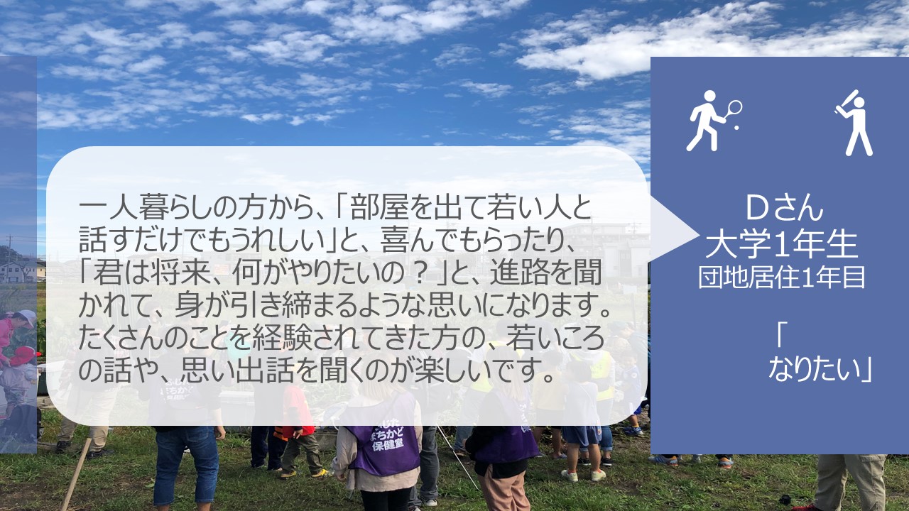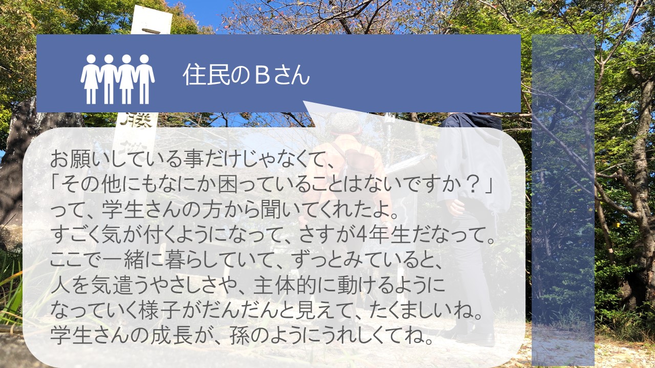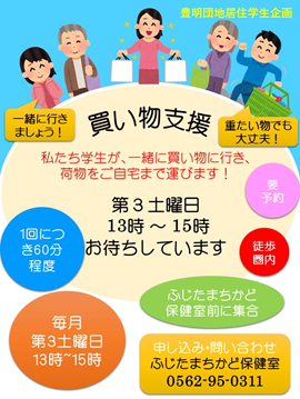 恥ずかしがっていては活動にならず、積極的に主体的に行動する勇気と自信が少しづつ身についてきたように思います。高齢者の方の買い物のお手伝いをしながら、野菜の選び方や買い物のコツなど、私たちの方がたくさん教えていただくことがあり、地域住民の方との交流がとても楽しいです。