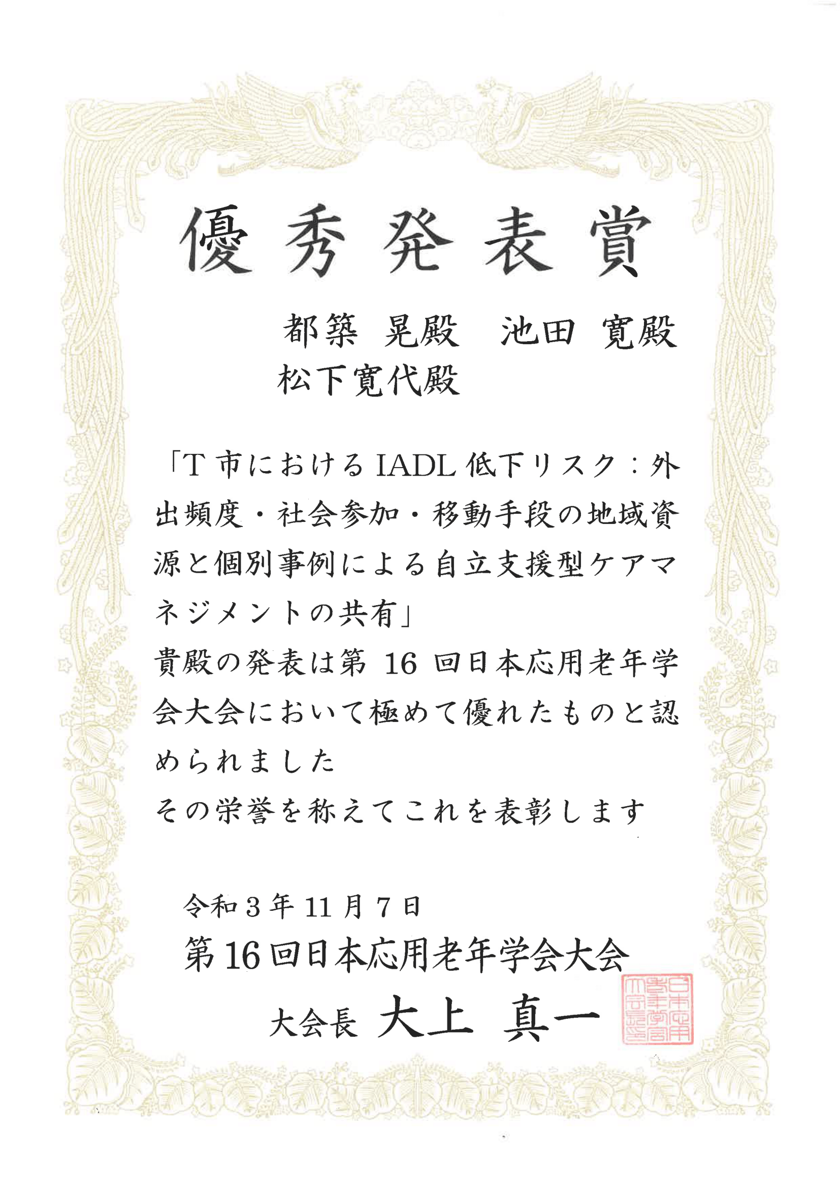 日本応用老年学会大会から表彰されました Tweet 2021年11月7日に第16回日本応用老年学会大会 大会長 大上真一氏から、 「T市におけるIADL低下リスク:外出頻度・社会参加・移動手段の地域資源と個別事例による自立支援型」を称えられ表彰されました。 賞状・勲章の画像を掲載いたします。