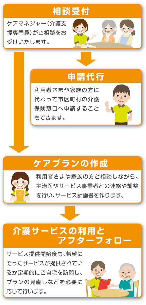 介護を必要とする方が、住み慣れた家で、その人らしく生活ができるように、ケアマネジャーが利用者さま(要介護者)や家族の方のご要望を尊重し、心身の状態や家庭の状況を考慮してケアプランの作成を行い、介護サービスの利用ができるように調整します。サービス開始後も、適切なサービスが受けられる様に定期的にご自宅を訪問します。
