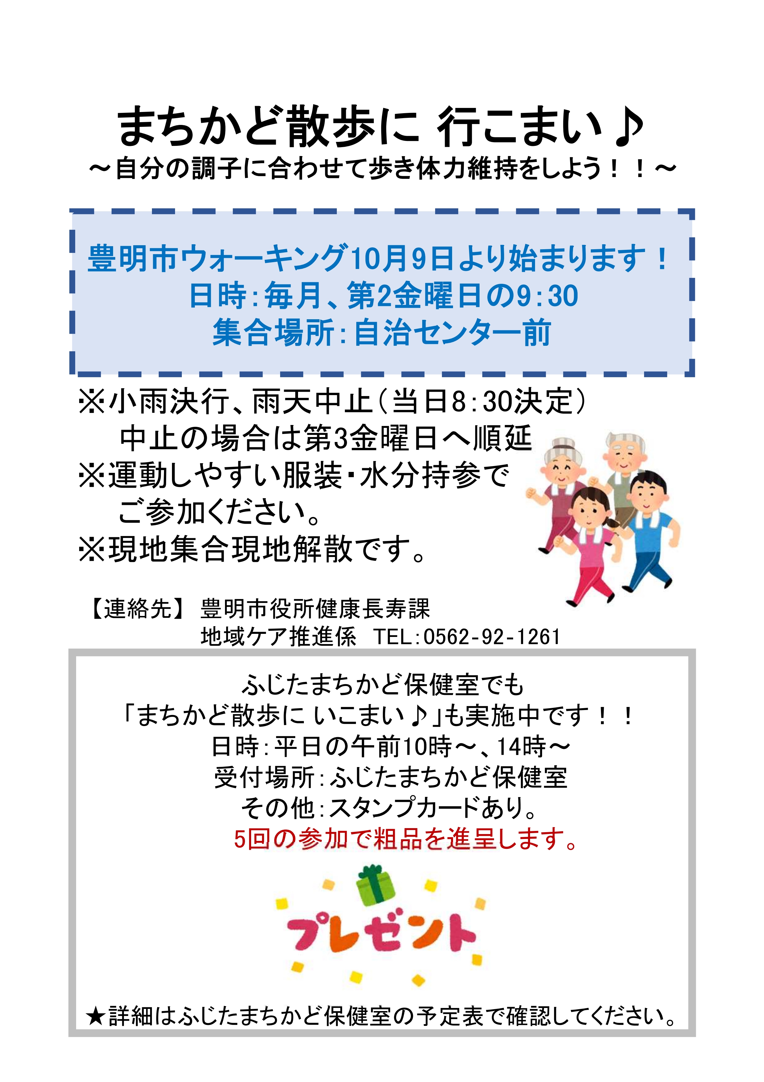 ふじたまちかど保健室では、散歩を行っていただくことで、みなさまの体力が維持・向上されることを支援しています。散歩の前後に保健室にお立ち寄りいただくと、健康スタンプを押します。スタンプがたまるごとに粗品をプレゼントしています!