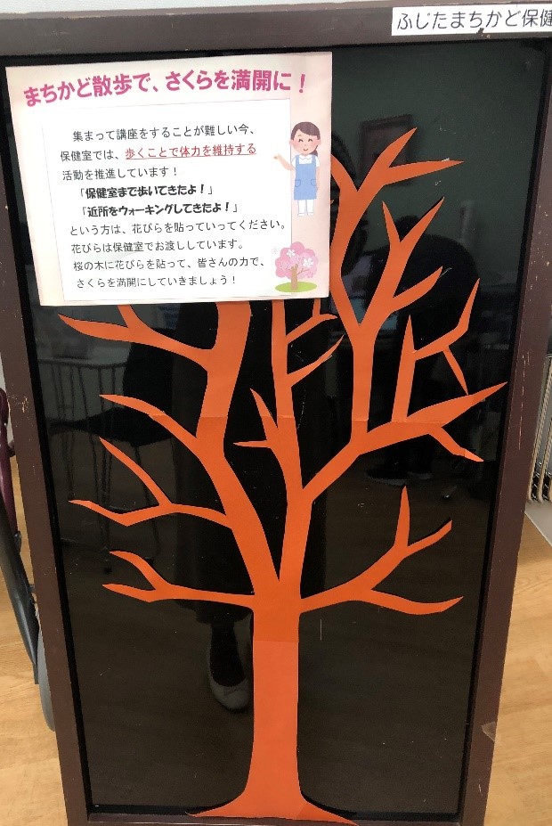 「保健室に歩いてきたよ」という方「近くを散歩してきたよ」という方はぜひ、さくらの花びを貼ってください。さくらの花びらは、まちかど保健室でお渡ししています。お気軽に、スタッフにお声かけください!