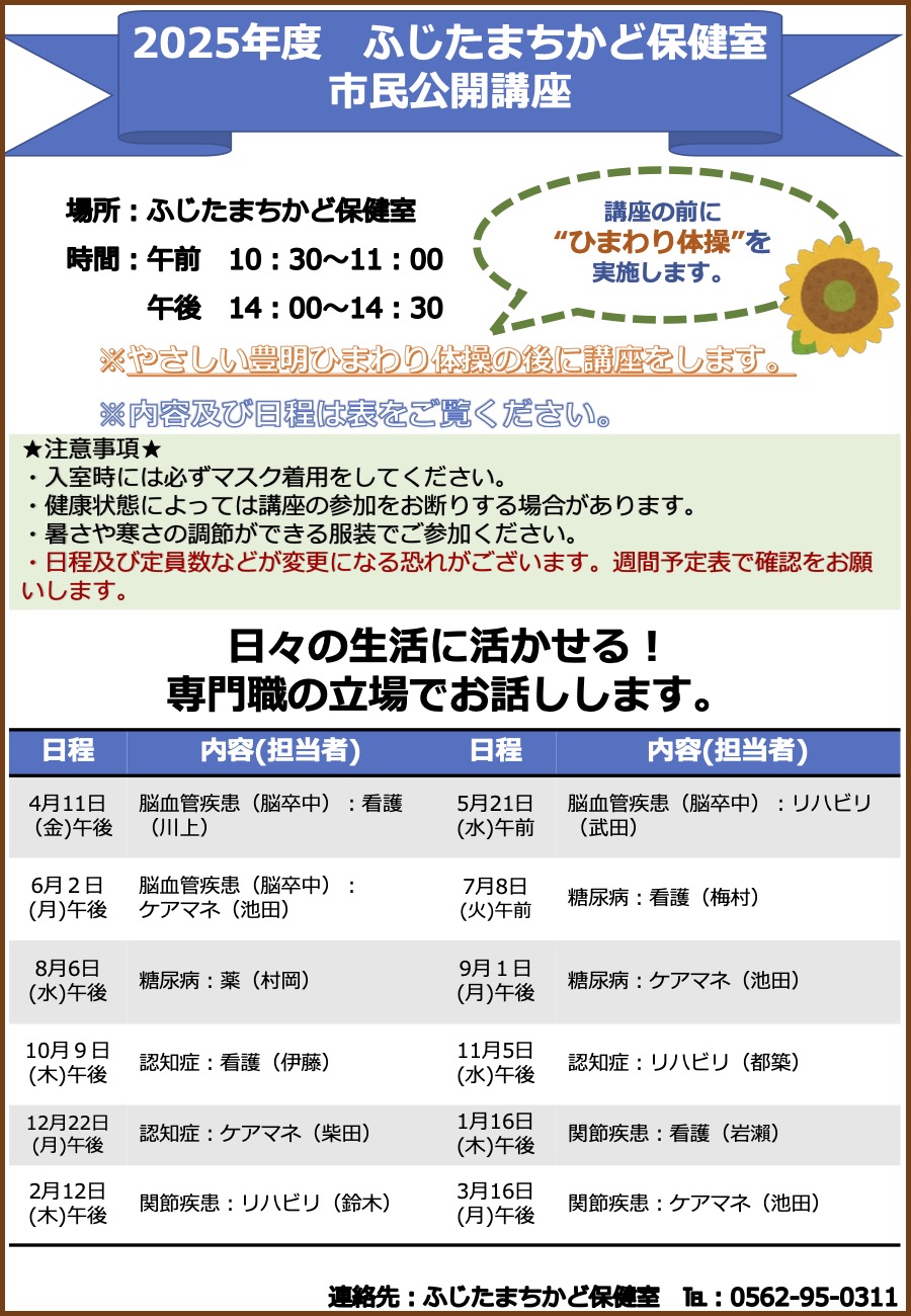 2025年度 ふじたまちかど保健室市民公開講座を更新しました。看護師、理学療法士、ケアマネージャー、薬剤師が専門職の立場でお話しします。参加費はもちろん無料です。どなたでも参加できます。初めての方も大歓迎で~す♪