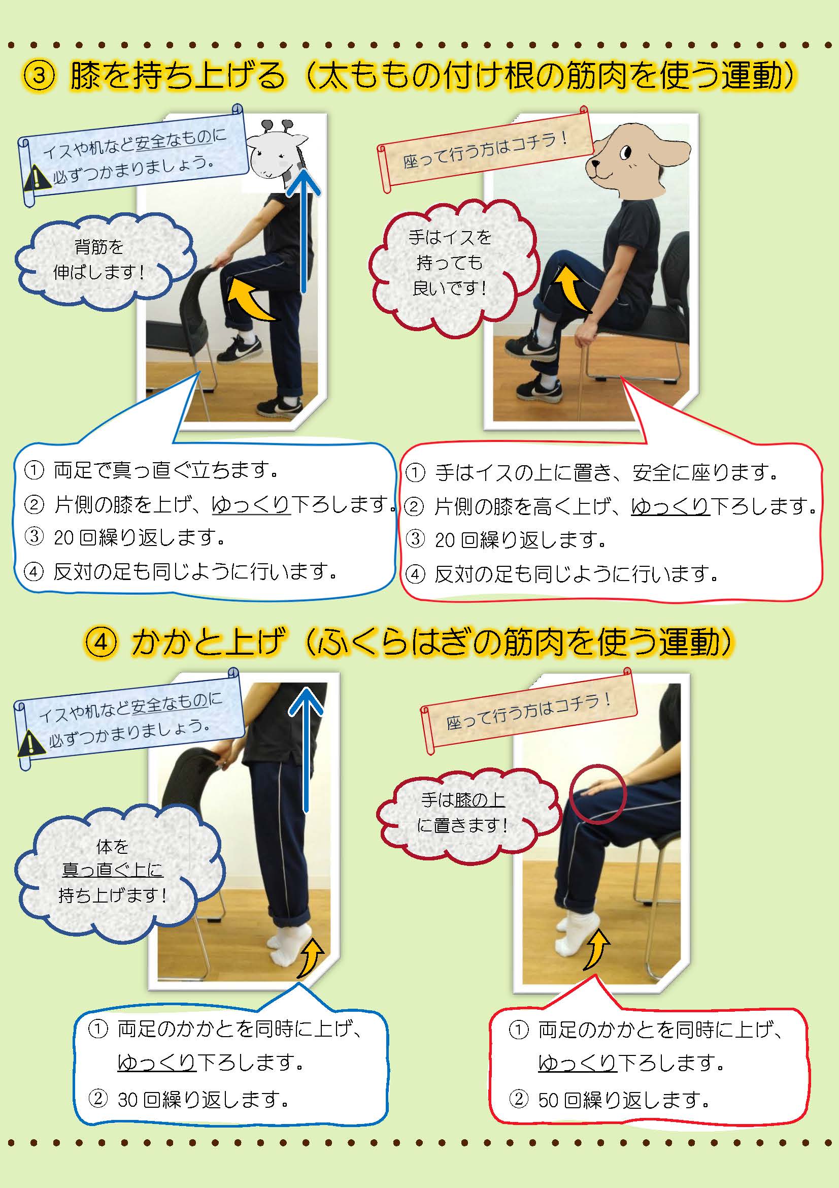 この運動では、椅子から立ち上がるときや、歩くときに使う筋肉を刺激します。これらの筋肉は、日常の生活には欠かせない筋肉ですが、気が付かない間に少しづつ弱っていくと、つまづきやすくなったり、転びやすくなります。