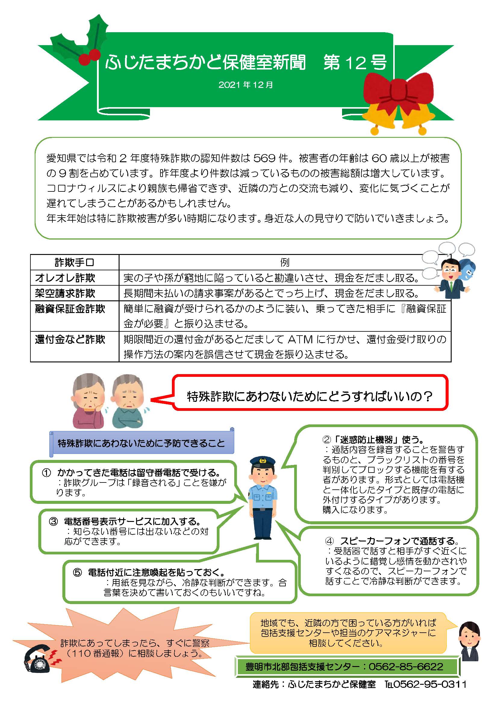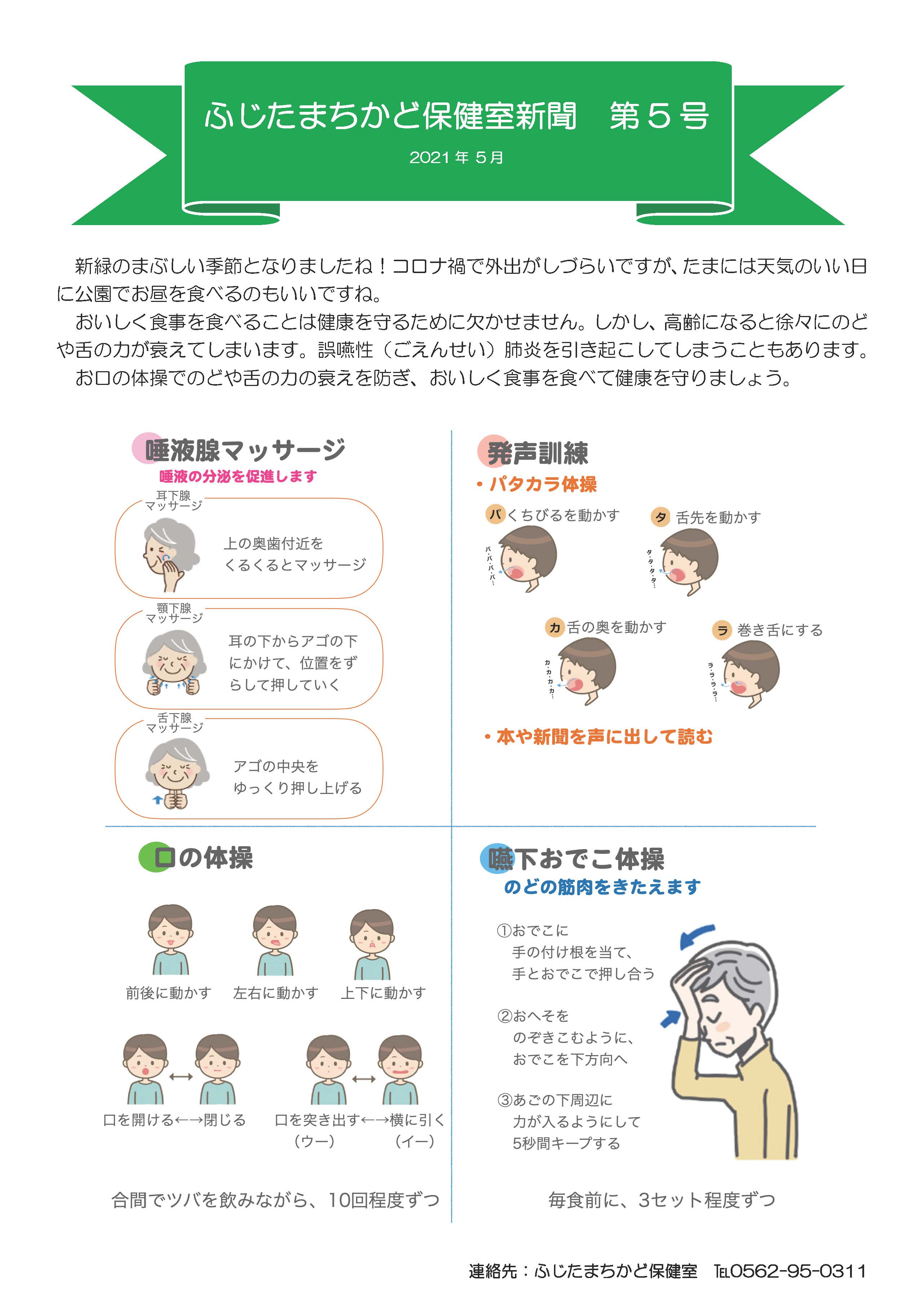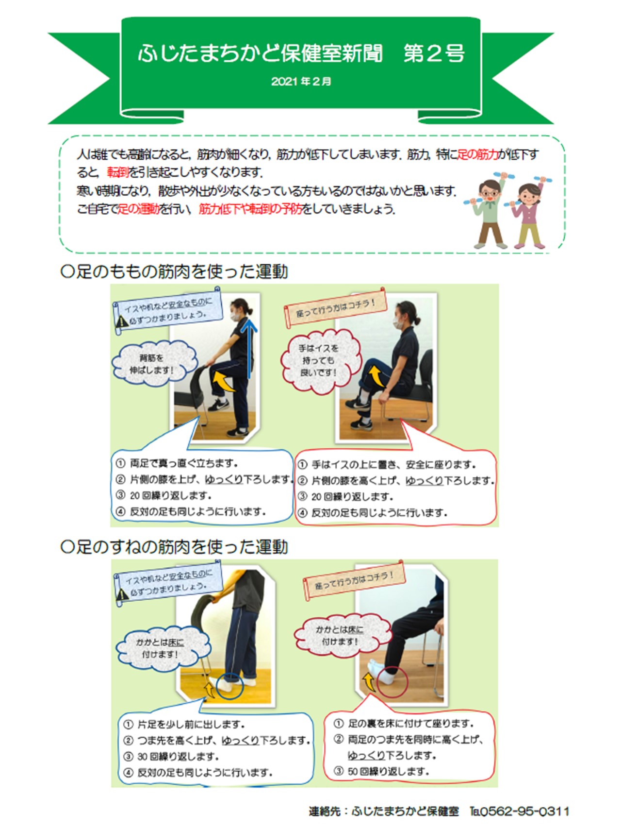 ふじたまちかど保健室新聞 Tweet ふじたまちかど保健室新聞をはじめました ふじたまちかど保健室では、健康や暮らしに関する情報をお届けするために、毎月、保健室新聞を発刊することになりました。保健室では最新号を配布しています。お立ち寄りの際は、ぜひ、お手に取ってみてくださいね。 また、ホームページからもご覧いただけるように、以下にご紹介します。 第11号 第9号 第7号 第5号 第3号 第1号 第12号 第10号 第8号 第6号 第4号 第2号