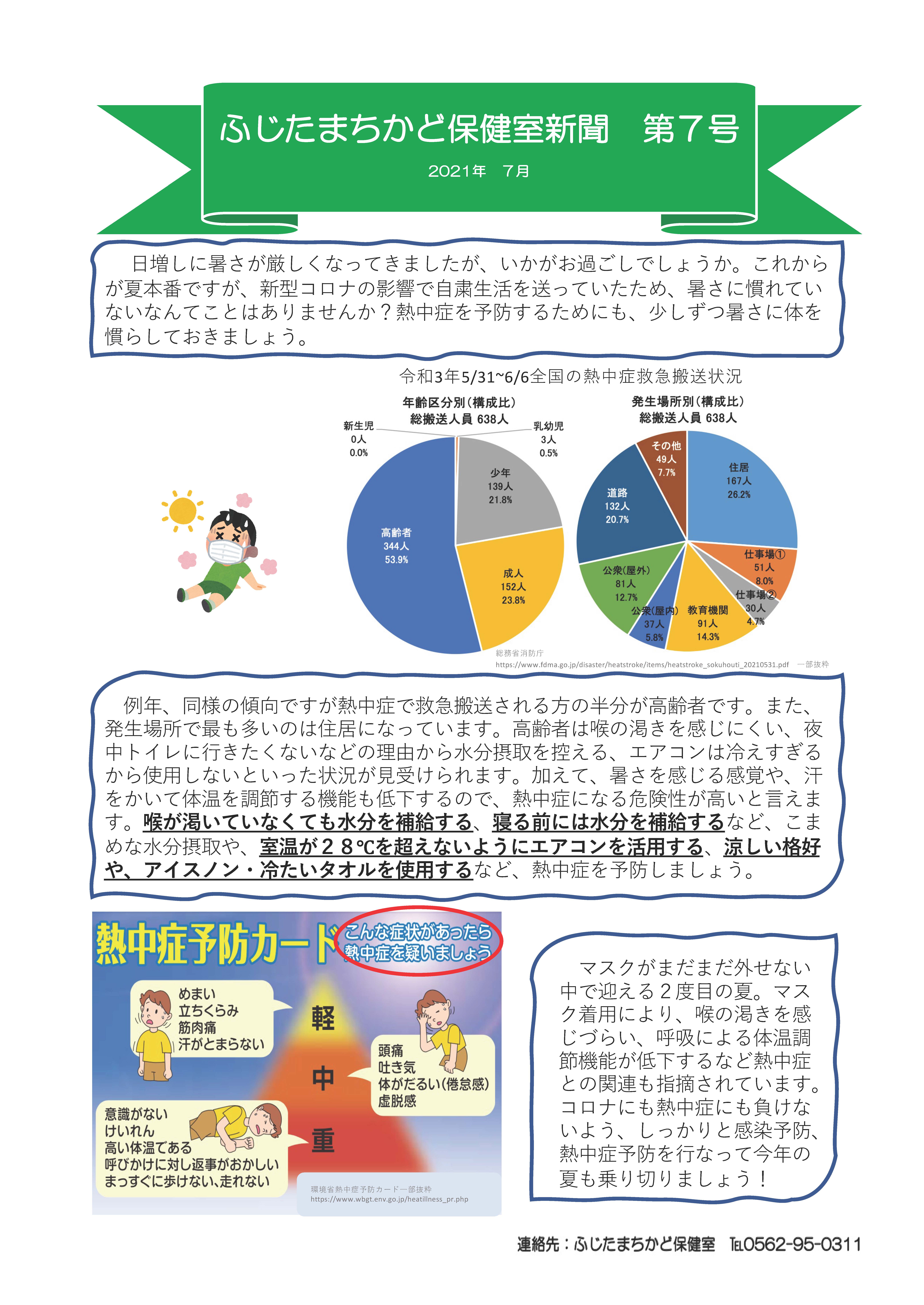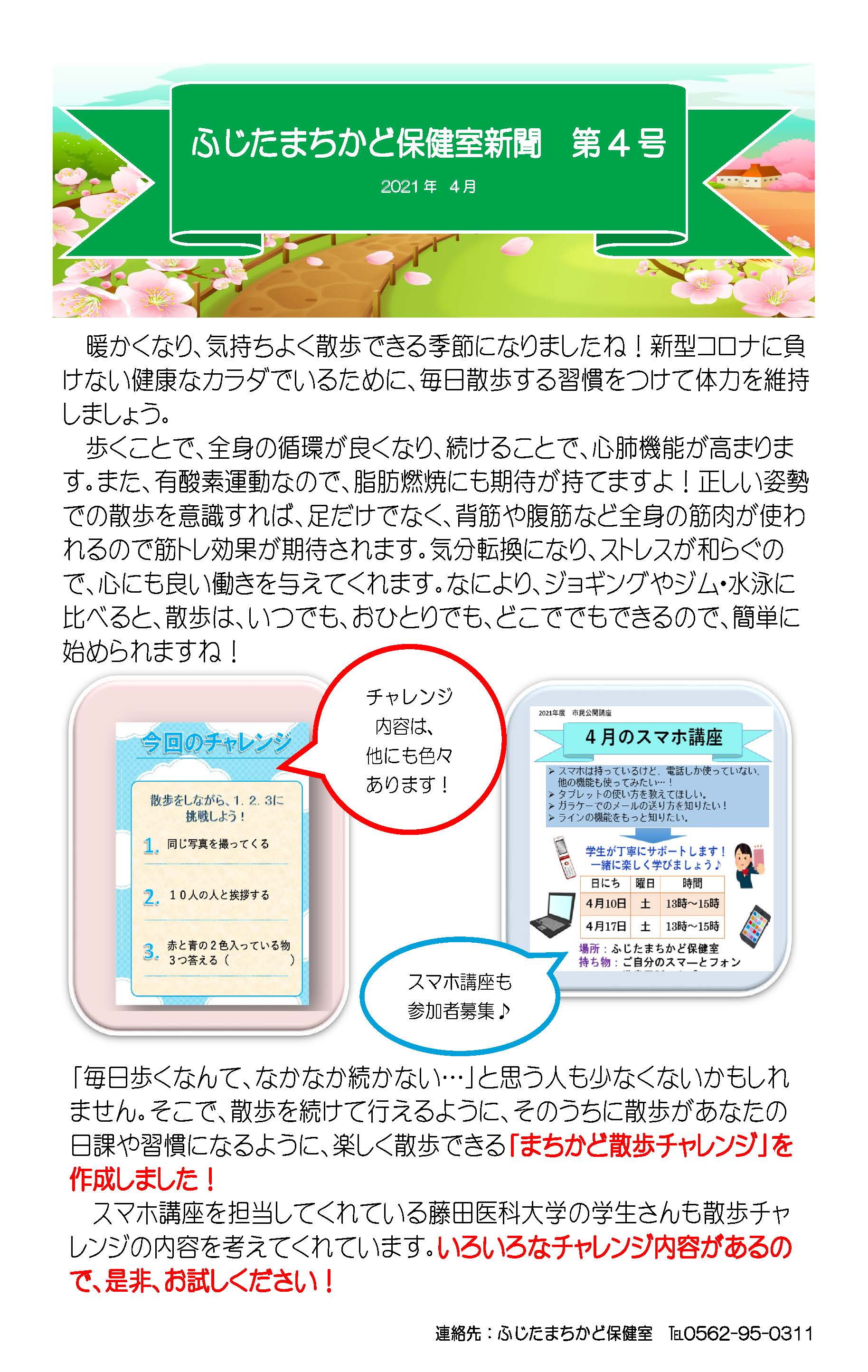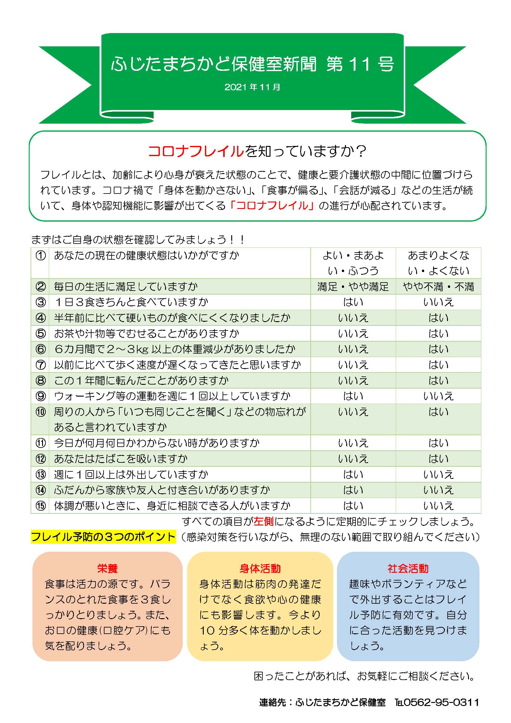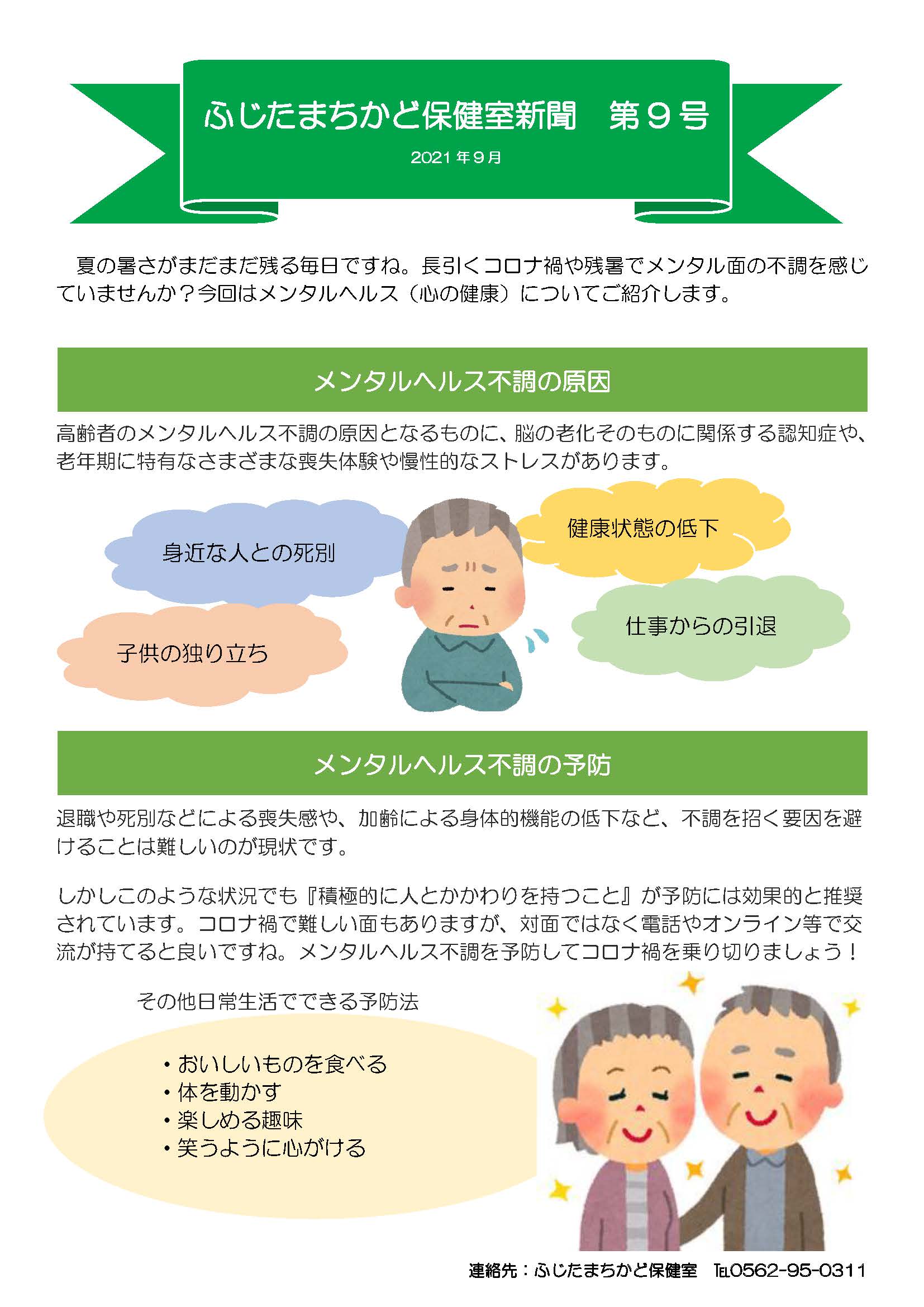 ふじたまちかど保健室新聞 Tweet ふじたまちかど保健室新聞をはじめました ふじたまちかど保健室では、健康や暮らしに関する情報をお届けするために、毎月、保健室新聞を発刊することになりました。保健室では最新号を配布しています。お立ち寄りの際は、ぜひ、お手に取ってみてくださいね。 また、ホームページからもご覧いただけるように、以下にご紹介します。 第11号 第9号 第7号 第5号 第3号 第1号 第12号 第10号 第8号 第6号 第4号 第2号