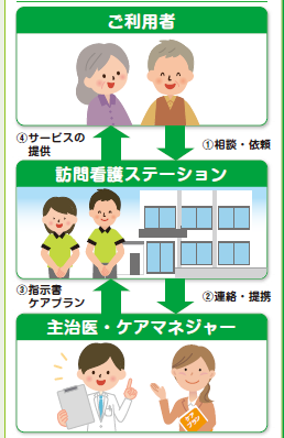 利用者さまが、住みなれたご家庭で快適に生活できるよう主治医の指示により、必要な看護サービスを提供するのが訪問看護ステーションです。利用者さまの病気や障がいの程度に合わせた看護やリハビリ、お薬相談や栄養指導など、各専門スタッフが責任をもって行います。
