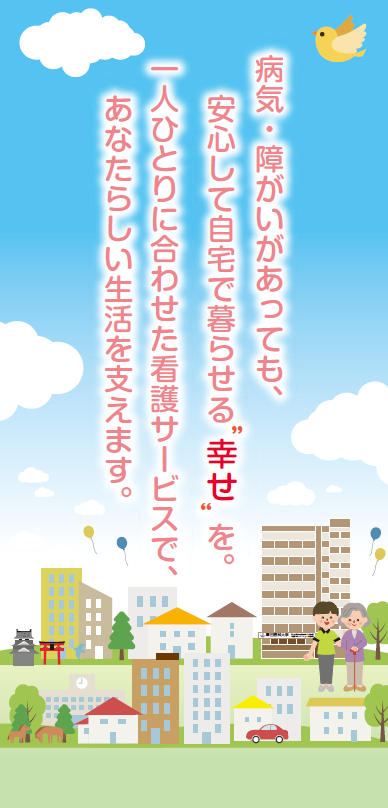 がんや認知症、難病等あらゆる疾病の新生児から高齢者の利用者さまや家族の方のご希望をお聴きしながら、看護師、理学療法士等が訪問して在宅療養の支援を行います。