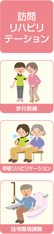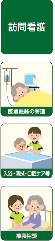 利用者さまが、住みなれたご家庭で快適に生活できるよう主治医の指示により、必要な看護サービスを提供するのが訪問看護ステーションです。利用者さまの病気や障がいの程度に合わせた看護やリハビリ、お薬相談や栄養指導など、各専門スタッフが責任をもって行います。