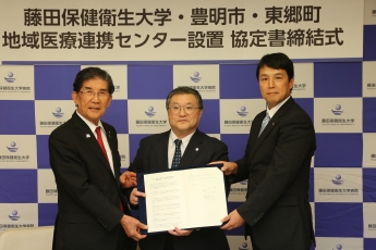 本学と豊明市、東郷町は、平成28年10月20日に豊明東郷地域地域医療連携センター(仮称)設置に関する協定を締結しました。