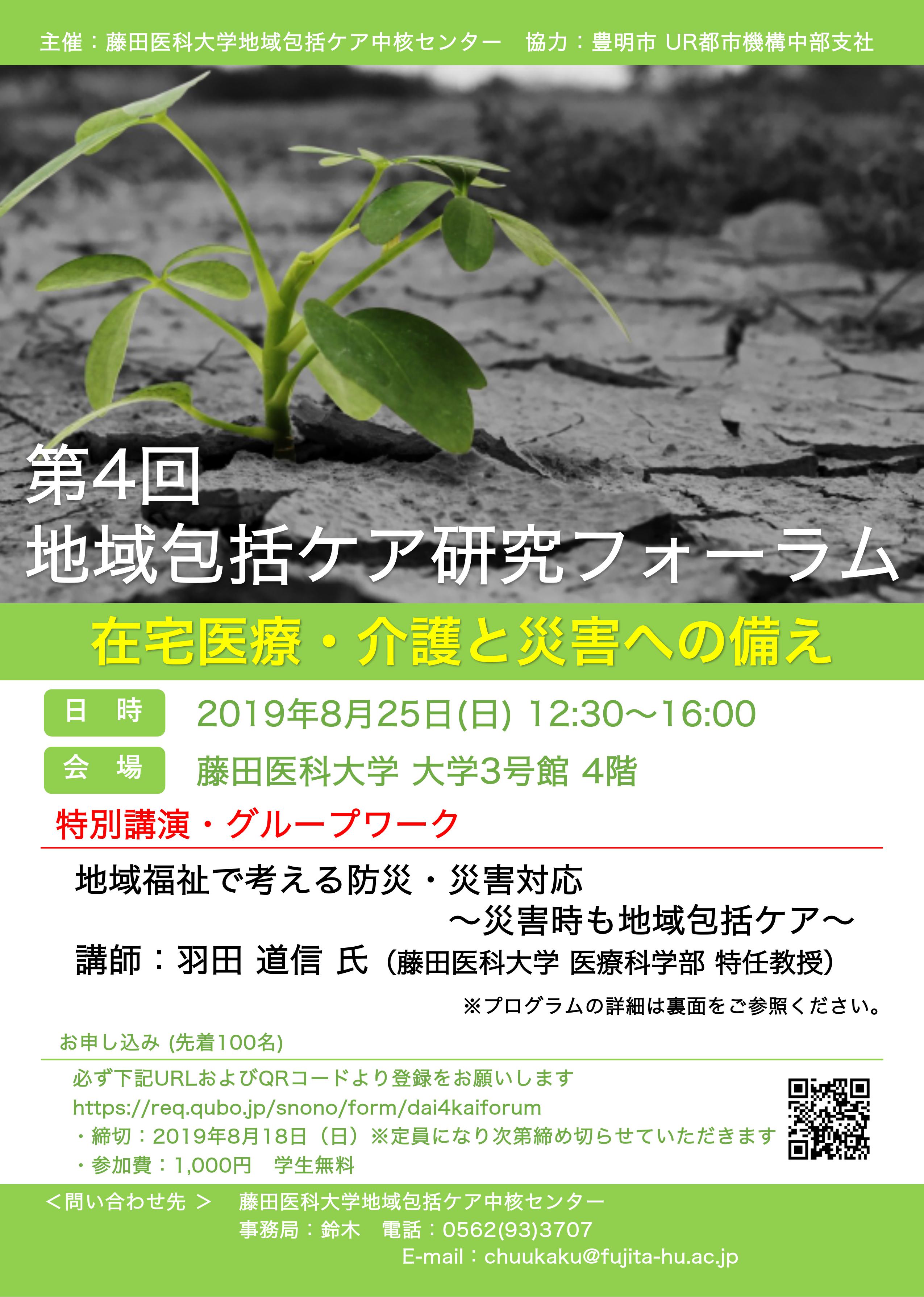 第4回地域包括ケア研究フォーラムを開催しました。県内各地から医療職や介護職、行政関係者、学生など総勢約200名にご参加いただき、盛会のうちに終えることができました。参加者、講師の皆様に心より感謝申し上げます。また、開催にあたりご協力いただきました豊明市、UR都市機構中部支社の皆様に深く感謝致します。今回はテーマを「在宅医療・介護と災害への備え」とし、災害発生時の行政や災害拠点病院、災害支援チームの役割について学びました。また、グループワークでは、臨場感あふれる様々な場面設定の中での状況判断について議論され、災害対応について主体的に考えるきっかけとなりました。次年度も引き続き災害対策についての内容で開催予定となっておりますので、ぜひご参加ください。