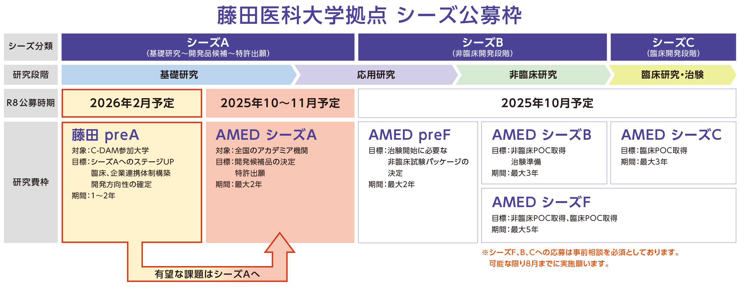 | preF | 非臨床POC取得に必要な試験パッケージの策定ならびに産学協働体制の確立を目指す研究開発課題 | 上限10,000千円/年/課題 | 最長2年度 | 2段階審査 <1段階目> 藤田医科大学 拠点審査 <2段階目> AMED審査 |