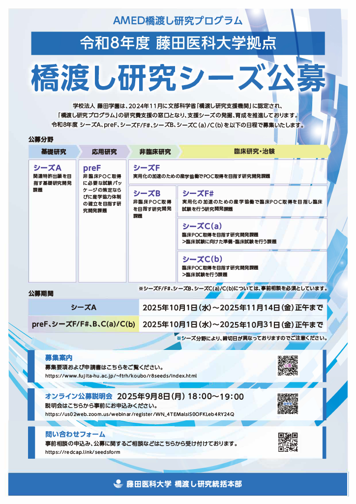 この度、藤田医科大学拠点として、文部科学大臣が認定した「橋渡し研究支援機関」の基盤を活用するAMED「橋渡し研究プログラム」の令和8年度 研究シーズを以下の日程で募集いたします。
