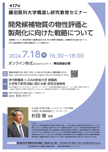 | 第17回 | 7月18日 | 開発候補物質の物性評価と製剤化に向けた戦略について | 北海道大学病院 医療・ヘルスサイエンス研究機構 元教授・現 臨床開発コーディネーター 杉田 修 先生 |