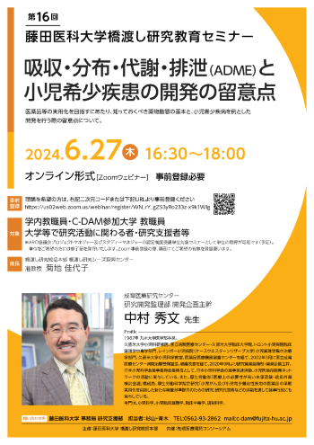 | 第16回 | 6月27日 | 吸収・分布・代謝・排泄(ADME)と小児希少疾患の開発の留意点 | 国立成育医療研究センター 研究開発監理部 開発企画主幹 中村 秀文 先生 |