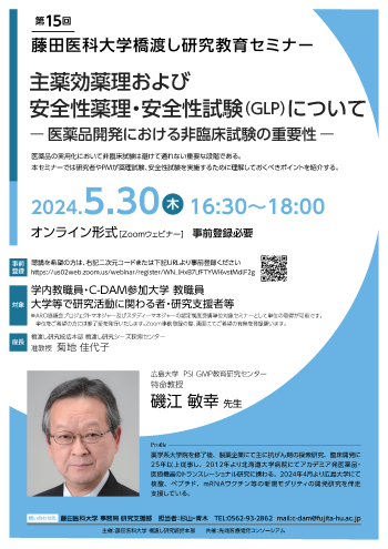 | 第15回 | 5月30日 | 主薬効薬理および安全性薬理・安全性試験(GLP)について | 広島大学 PSI GMP教育研究センター 特命教授 磯江 敏幸 先生 |