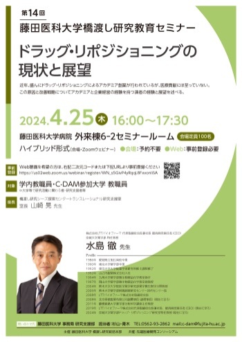 | 第14回 | 4月25日 | ドラッグ・リポジショニングの現状と展望 | 株式会社LTTバイオフォーマ 代表取締役会長兼社長/CEO 水島 徹 先生 |