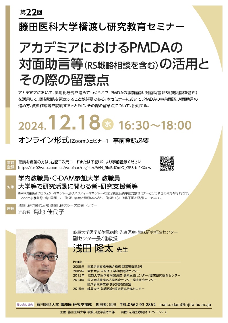 | 第22回 | 12月18日 | アカデミアにおけるPMDAの対面助言等 (RS戦略相談を含む)の活用とその際の留意点 | 岐阜大学医学部附属病院 先端医療・臨床研究推進センター 副センター長・准教授 浅田 隆太 先生 |