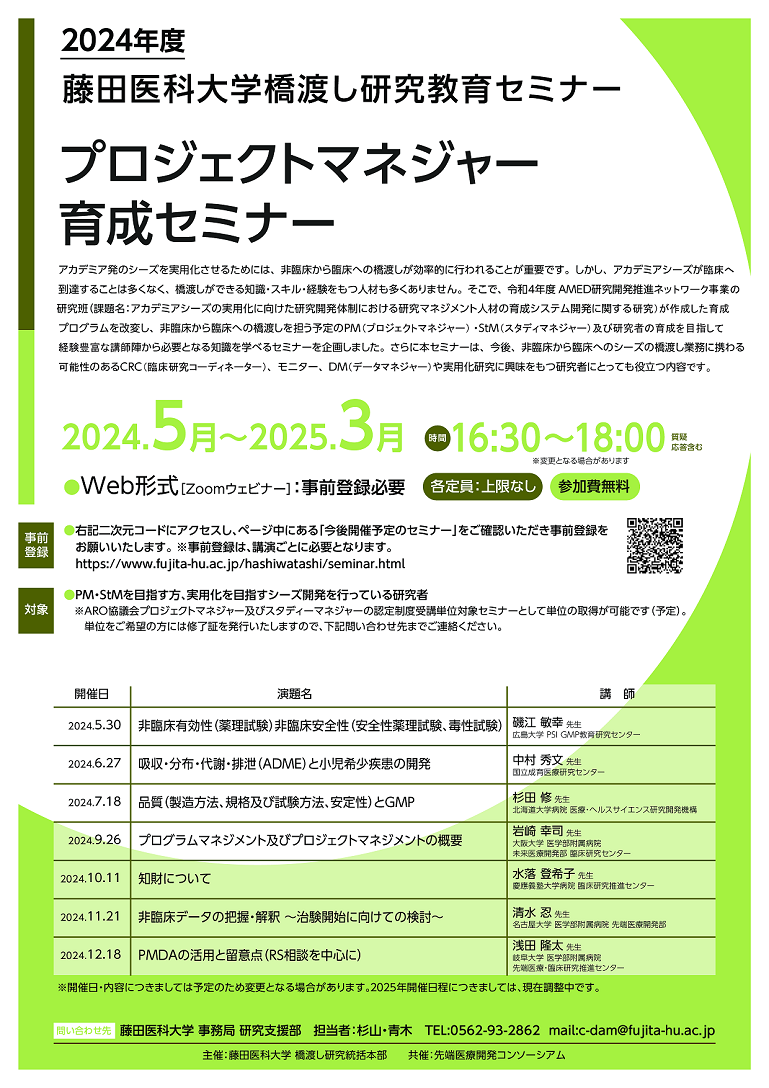 | 第19回 | 9月26日 | プログラムマネジメント及びプロジェクトマネジメントの概要 | 大阪大学 医学部附属病院 未来医療開発部 臨床研究センター 特任教授 岩崎 幸司 先生 |