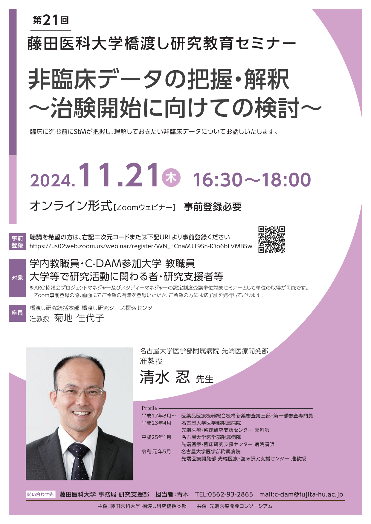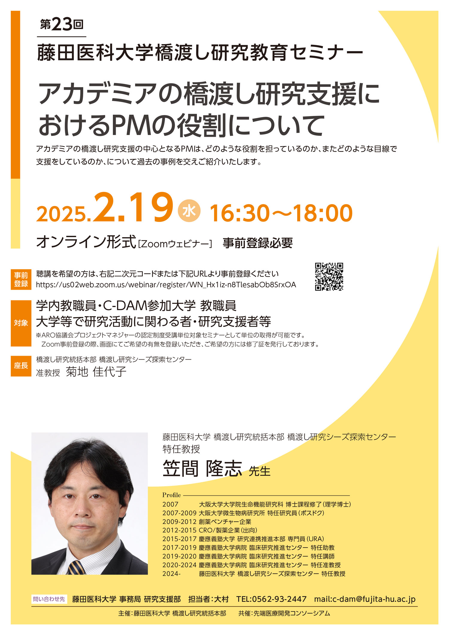 | 第23回 | 2月19日 | アカデミアの橋渡し研究支援におけるPMの役割について | 藤田医科大学 橋渡し研究統括本部 橋渡し研究シーズ探索センター 特任教授 笠間 隆志 先生 |