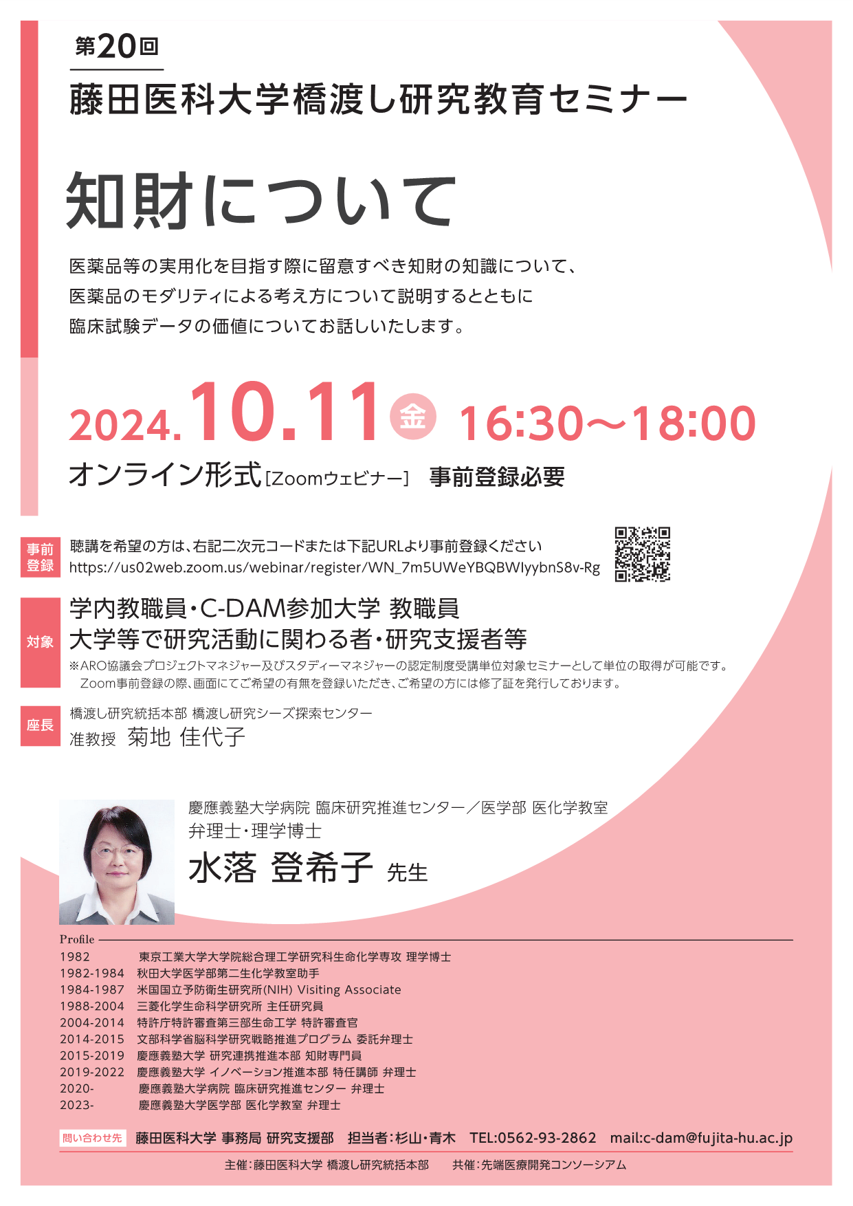 | 第20回 | 10月11日 | 知財について | 慶應義塾大学病院 臨床研究推進センター/医学部医化学教室 弁理士・理学博士 水落 登希子 先生 |