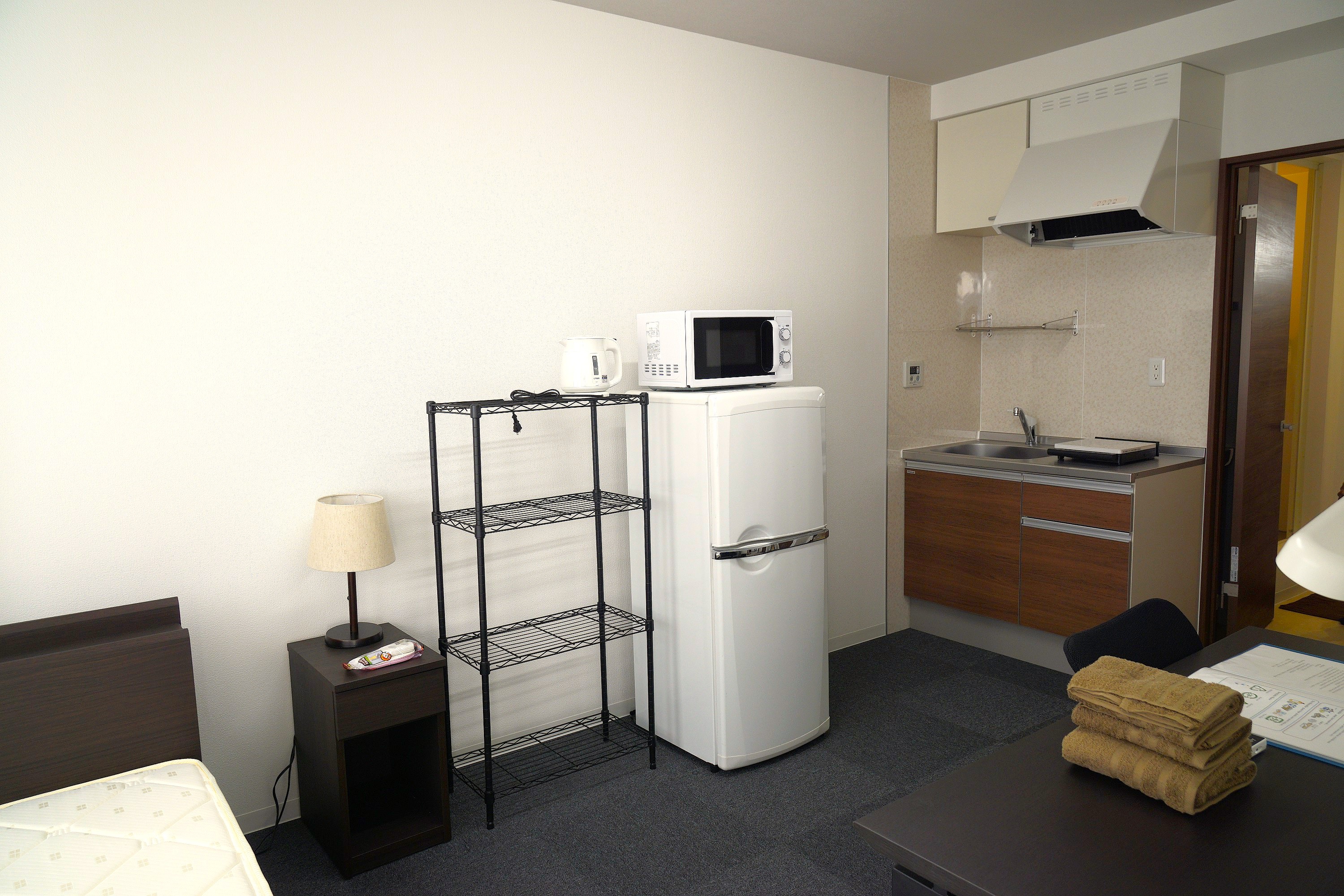 Each standard room is furnished with a single bed, desk, chair, a small kitchen area with an IH stove, refrigerator, internet connection, air conditioner/heater, washing machine, and dryer.