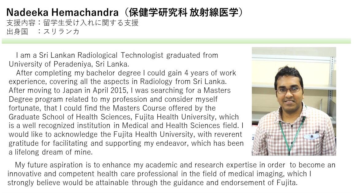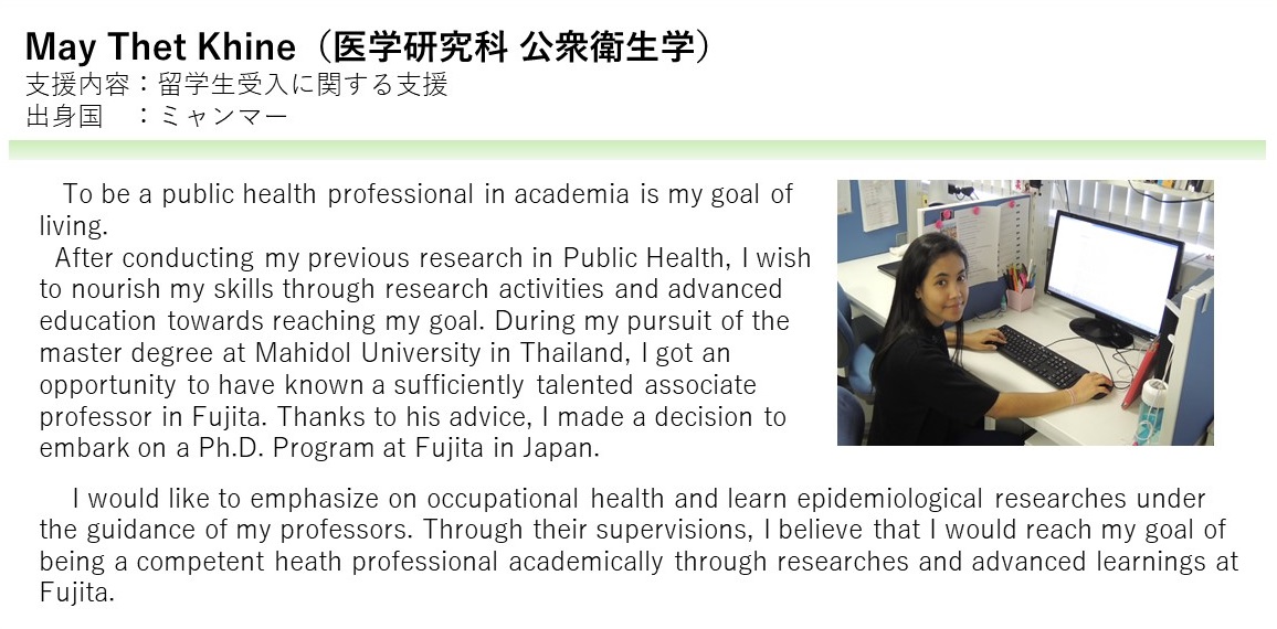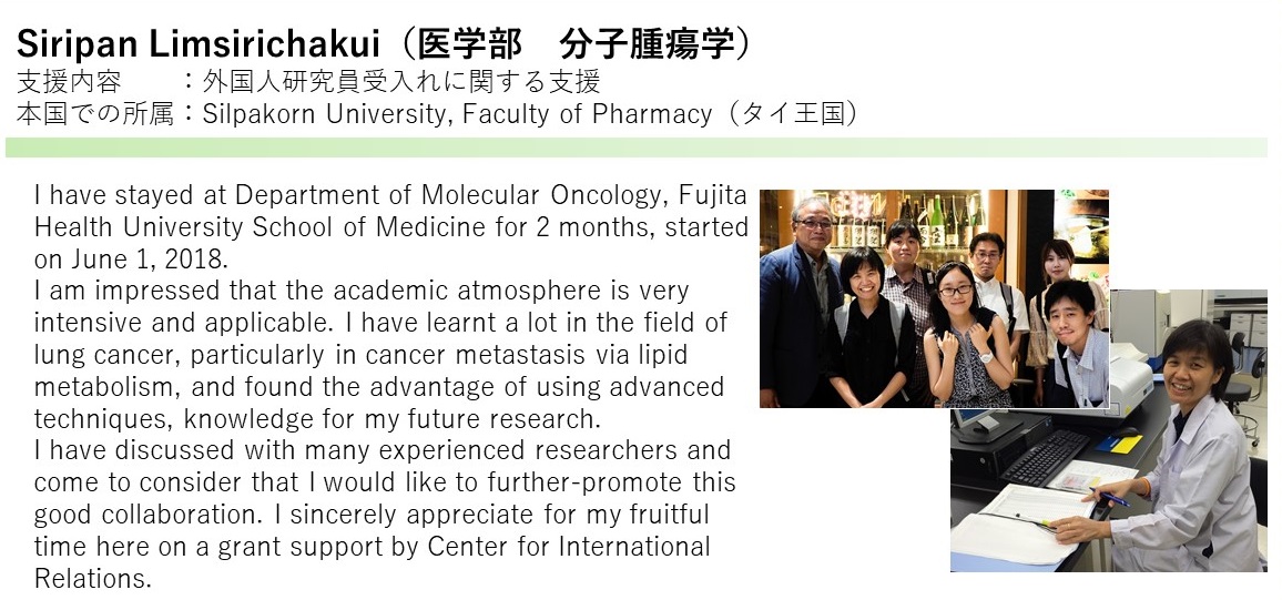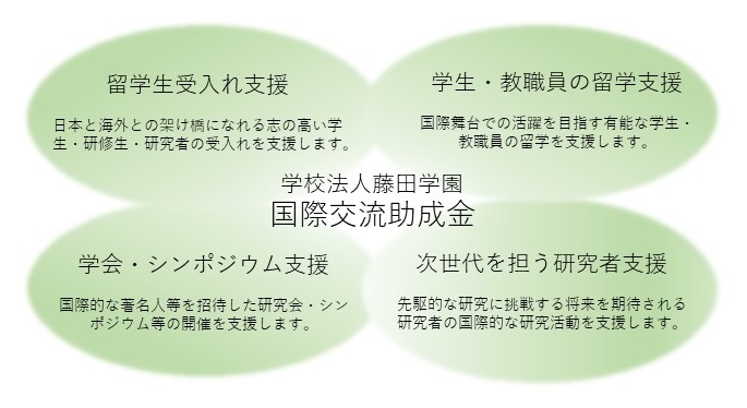 藤田学園は、国際交流活動に対する経済的支援をおこない、本学園の国際化を推進することで、国際社会で活躍する