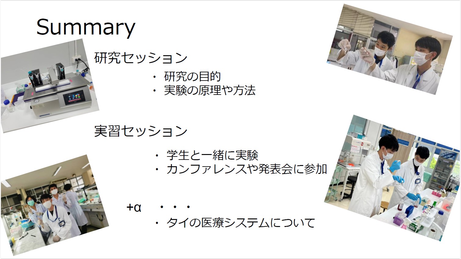 留学体験報告では、コンケン大学の各研究室で行っている研究の目的、実験の原理や方法などについて紹介し、日本とタイで使用している器具や方法の違いを講演しました。また、言語、渡航費用(宿泊費含む)、体調管理など、留学にあたり懸念される点も自身の体験についてふれ、異文化交流による海外留学の魅力を後輩たちに熱く語りました。