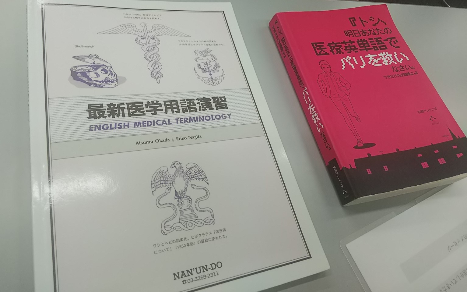医学用語については、学校指定の参考書「最新医学用語演習」と、独自で購入した「トシ、明日あなたの医療英単語でパリを救いなさい。」がとても分かりやすかったので、おすすめです。