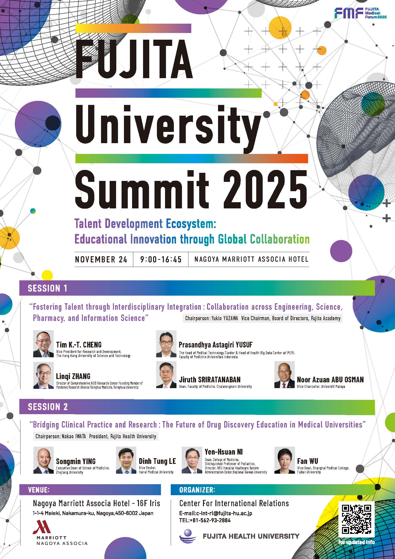 藤田医科大学は昨年度に引き続き、アジアトップレベルの大学のリーダーの方々を招いて、Fujita University Summit 2025を開催いたします。