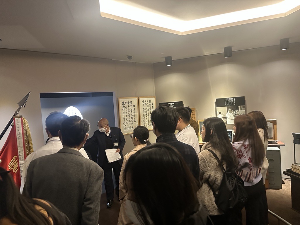 留学生、教職員18名が集まり、同窓会の丸田一皓名誉教授による説明を熱心に聞きながら、独創一理祈念館を見学しました。祈念館では故藤田啓介総長の医療や教育、研究に対する思いに触れながら、学園の歴史に理解を深めました。その後のフジタホール2000の見学では、参加者はその壮麗さや音響へのこだわりに驚き、総長の芸術に対する情熱に感心していました。