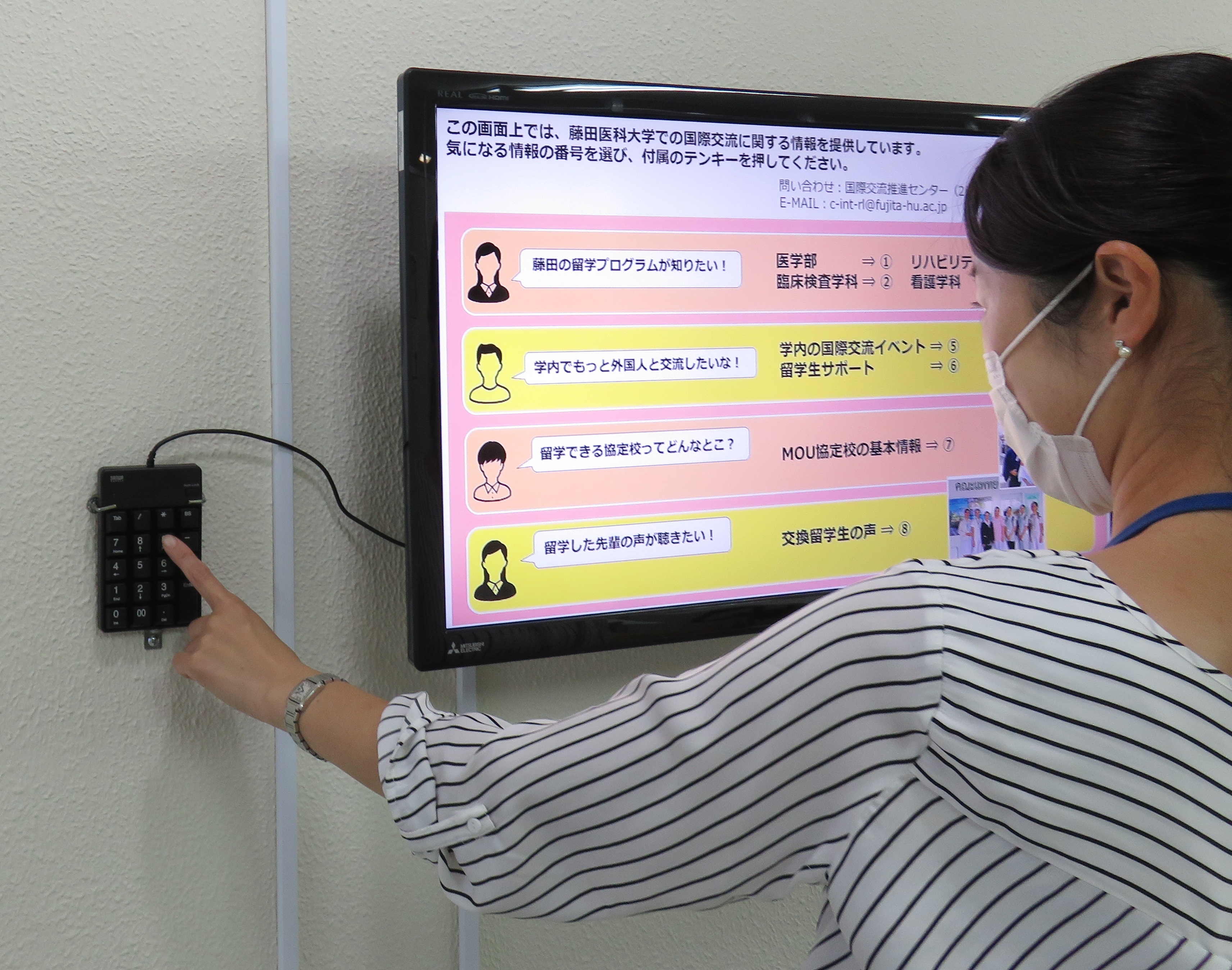 国際交流推進センターでは、本学の国際交流活動を周知するため、大学1号館B1階にあるEnglish Loungeに電子看板(デジタルサイネージ)を導入しました。掲載内容は本学の留学プログラムやMOU協定校の基本情報、国際交流に関わる情報等です。閲覧方法は、付属のテンキーを用い、利用者が閲覧したい情報を選択できるようになっています。