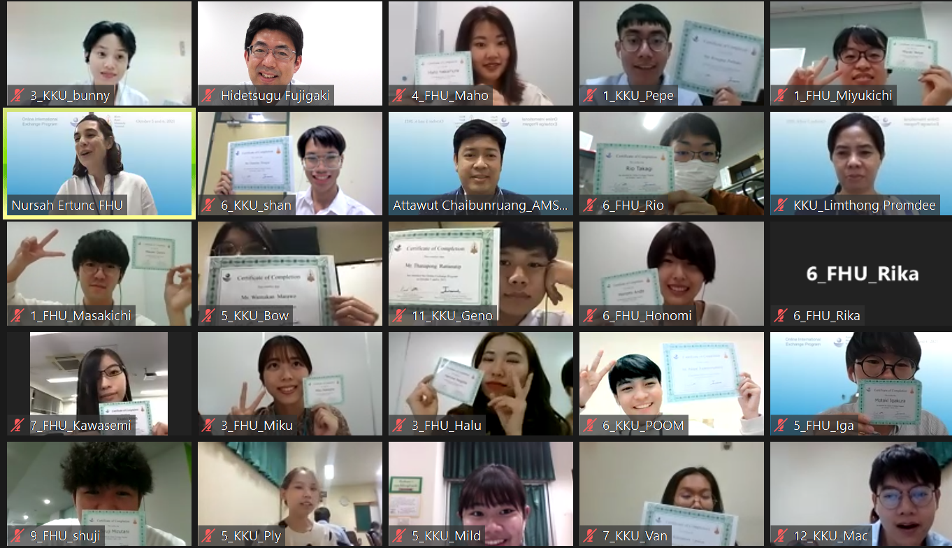 10月 5、6日の2日間、本学の臨床検査学科とコンケン大学(タイ)とのオンラインシーズンスクールが開催され、本学の学生 25名とコンケン大学の学生 16名が参加しました。学生による各研究室の紹介や、両校の教員による「日本でのCOVID-19について」「タイでのCOVID-19臨床検査について」のレクチャーが行われました。グループワークでは、「医療スタッフとして今後COVID-19のようなパンデミックにどう対応するか」についてディスカッションとグループごとのプレゼンテーションが実施されました。また、異文化交流活動として、お互いの文化や学内の様子を共有しました。学生からは、日本とタイを行き来できる日が来ることを楽しみにしているとの声が聞かれました。