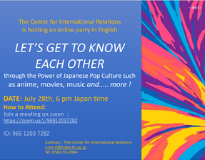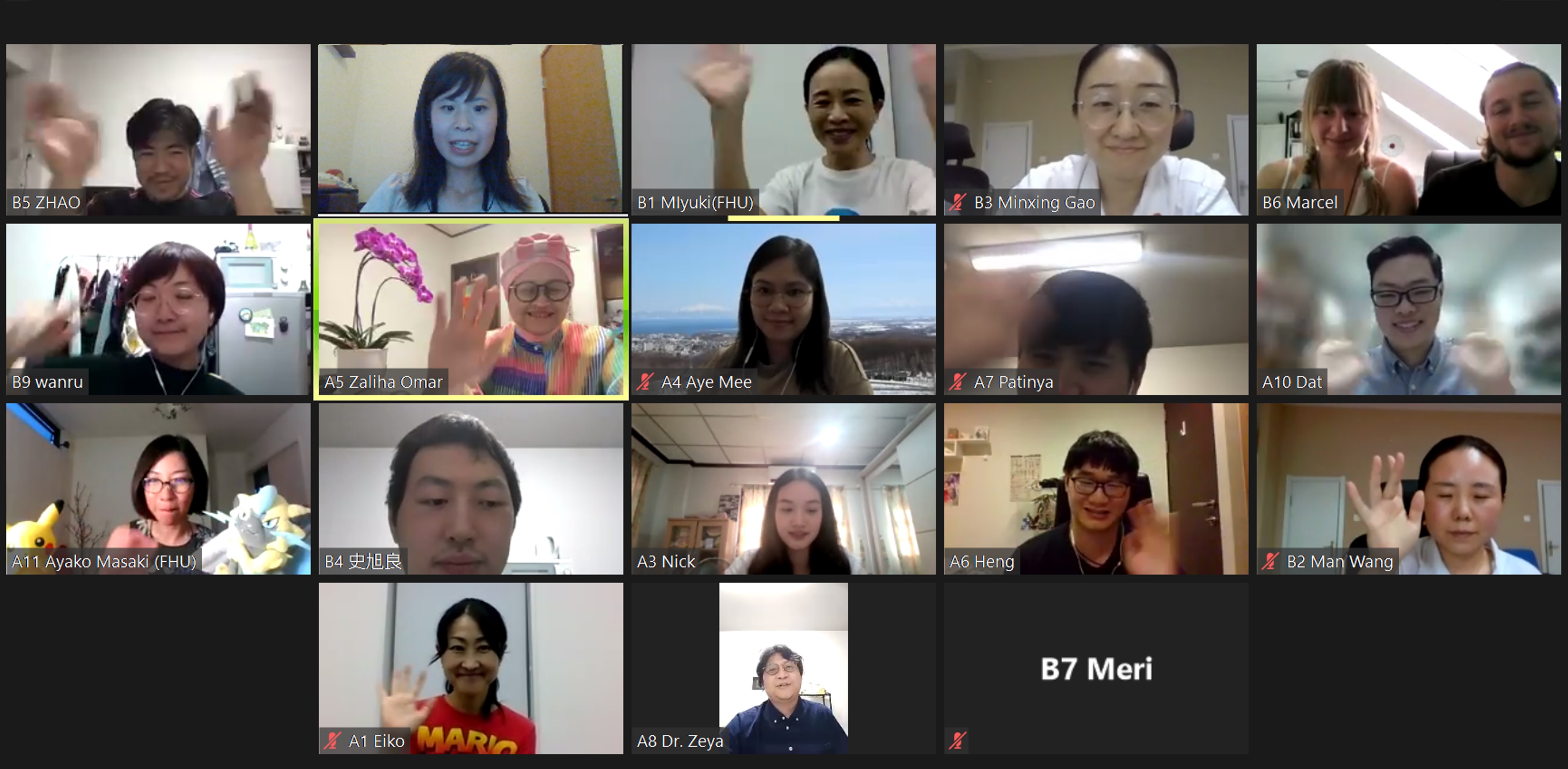 7月28日、国際交流推進センター主催のオンライン交流会を開催し、8か国16名の学生がイベントに参加しました。参加者の中にはコロナウイルス感染拡大の影響により1年以上も来日できていない学生もおり、どうなるか分からない状態に不安を感じている学生も少なくありません。そんな学生を励ますため、在学中の留学生らとZoomで繋ぎ、自己紹介を行った後、ゲームなどを楽しみました。学生からは「交友関係が築けて嬉しかった」、「早くコロナウイルスが収束に向かい、以前のように1Day tripやSports Dayを楽しみたい」などの声が聞かれました。センター員も1日も早く留学生が来日できることを祈っています。