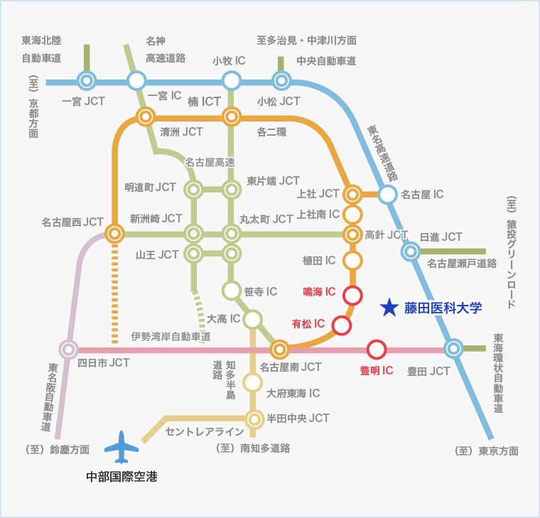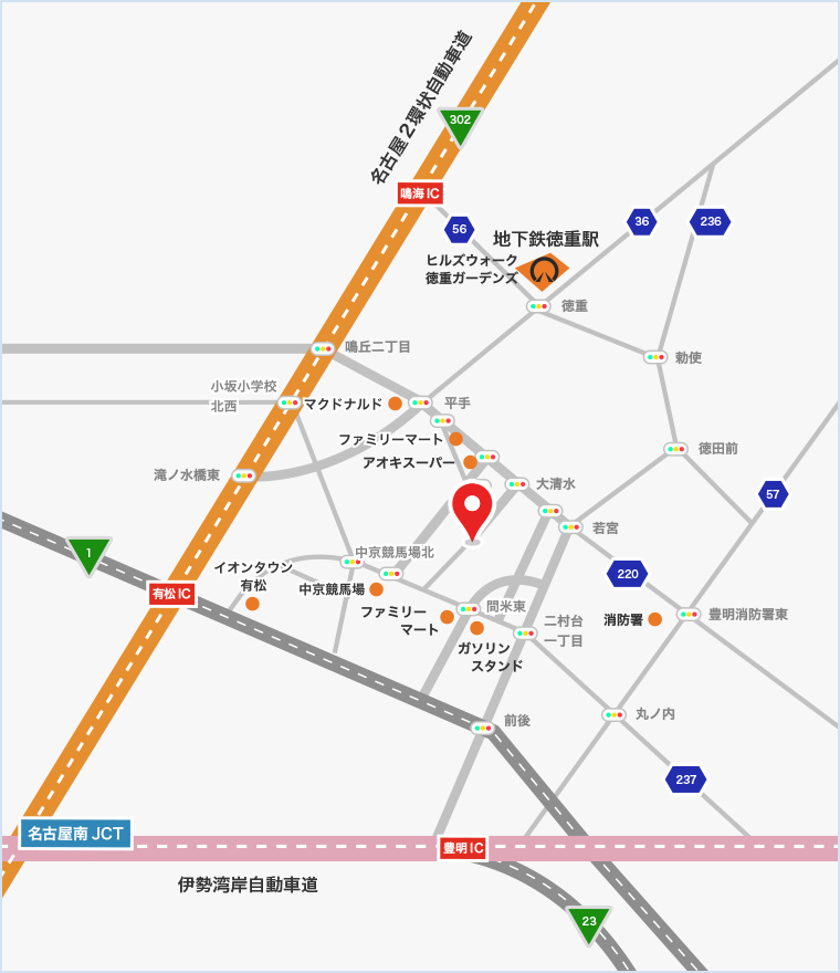 アクセス 電車・バスでのアクセス方法 最寄り駅は、名鉄名古屋本線「前後駅」および名古屋市営地下鉄桜通線「徳重駅」です。 お車でのアクセス方法 有料道路ご利用の場合 ・名古屋第二環状自動車道「鳴海IC」から約10分、または「有松IC」から約15分 ・伊勢湾岸自動車道「豊明IC」から約15分(東京方面からの出口) 拡大図